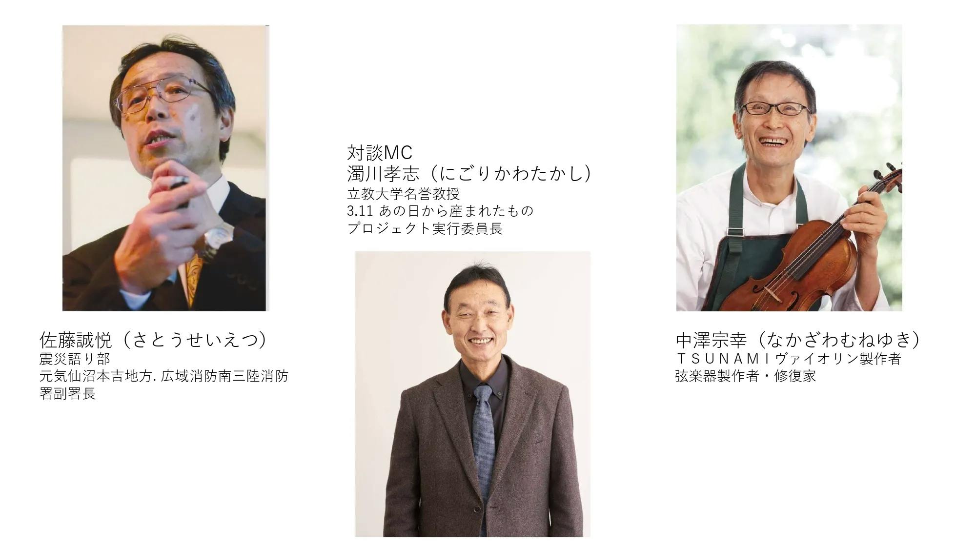 2021/09/15 11:359/11無事に本イベントは終了しました。まだアーカイブ視聴はできますので引き続きご覧いただけると幸いです。当日の様子を一部掲載します。濁川孝志講演佐藤誠悦講演TSUNAMIヴァイオリン佐藤誠悦、中澤宗幸、濁川孝志対談中澤きみ子TSUNAMIヴァイオリン千代園剛和太鼓TSUNAMIヴァイオリン×和太鼓×ピアノ出演者最後に実行委員長濁川孝志からの御礼を載せます。この度は私たちの企画イベント『3・11あの日から産まれたもの~想いを風化させないために』の実施に当たり、多大なるご支援を頂きました。ここに、心より厚く御礼申し上げます。皆様のご支援のお陰もあり、イベントは大成功の下無事実施することができました。昨年夏にこの企画がスタートして以来、このイベントはコロナ禍という大逆風に見舞われ、会場の変更、日程の変更等を余儀なくされ紆余曲折の末なんとか実施できたというのが実態でした。そんな中、予定した登壇者が誰一人欠けることもなく、全てのスタッフがこの会を支えてくれました。実行委員長として、本当に有り難く感謝に堪えません。これもひとえに、「あの3・11の出来事を、そう簡単に風化させたなるものか」という皆様の強い想いの表れかと感じております。人間には忘れ去らないと次の一歩が踏み出せないこともありますが、その一方で決して忘れてはならないこともあります。3・11の大きな教訓の一つは、我々日本人に「利他の心を思い出せ」ということでした。私たちはこの教訓を忘れることなく、同時に今でも進行形で存在する様々な問題に想いを馳せ、これからの日々を過ごして行きたいと思います。この出来事の語り部となり、末永く未来へ語り継ぎたいと思います。 繰り返しになりますが、再度、皆様のご支援に対する厚い感謝の意をここに表し、御礼のご挨拶に代えさせて頂きたいと思います。本当に、ありがとうございました。2021年9月12日 実行委員長 濁川孝志ご支援ありがとうございました。実行委員一同。 もっと見る
