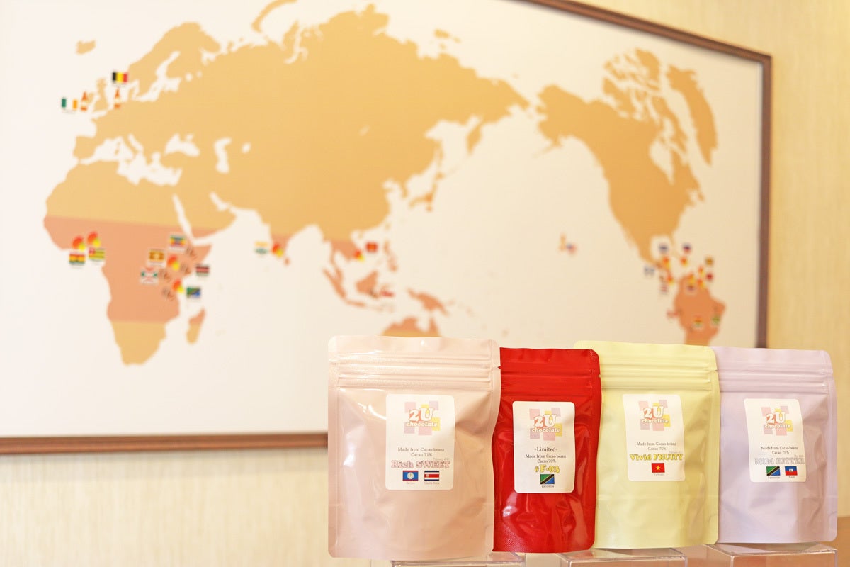 2U chocolate では「カカオ豆や他の素材の個性をできる限り多く愉しんでもらうこと、それこそが Bean to Bar やクラフトチョコレートの魅力に気づくきっかけになる」と考え、店舗オープン以来取り扱いカカオ産地とチョコレートの種類を意識的に増やしてきました。