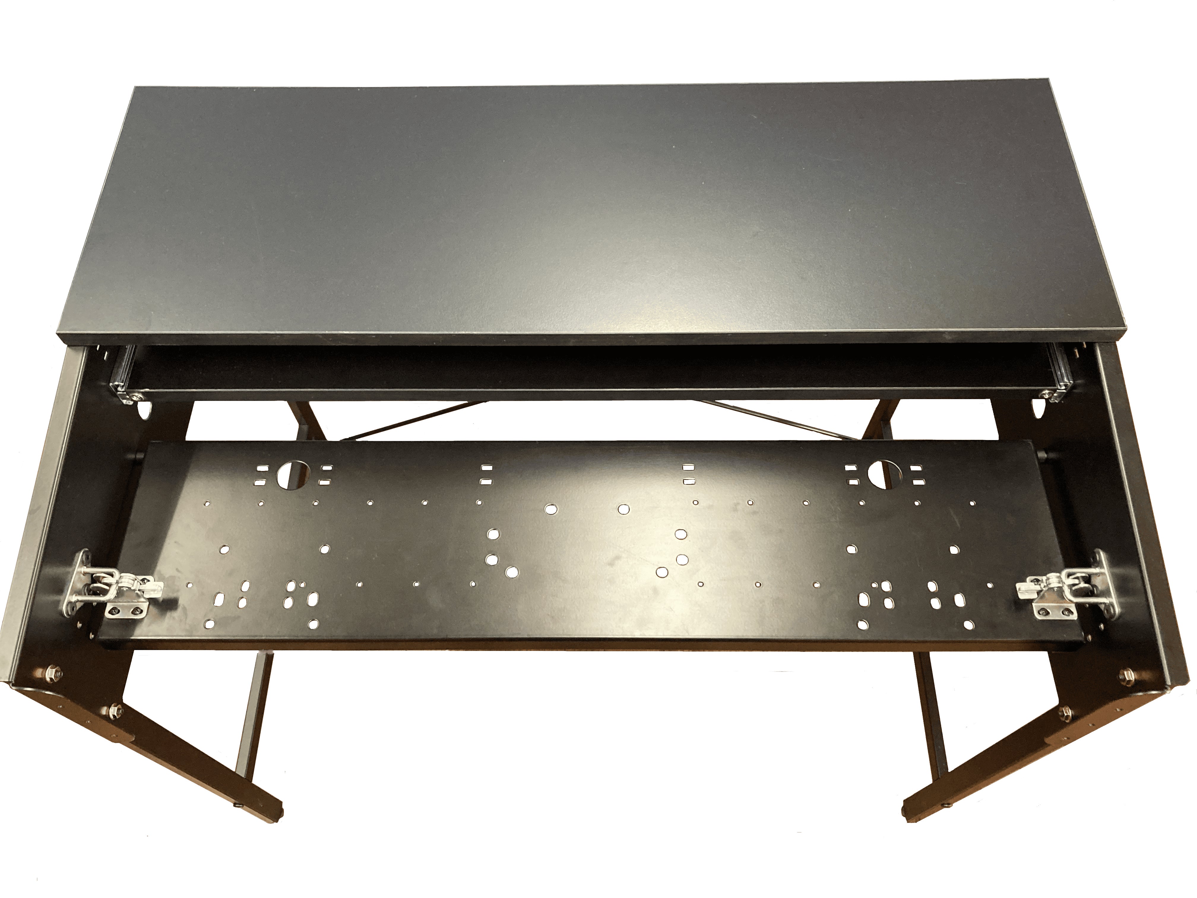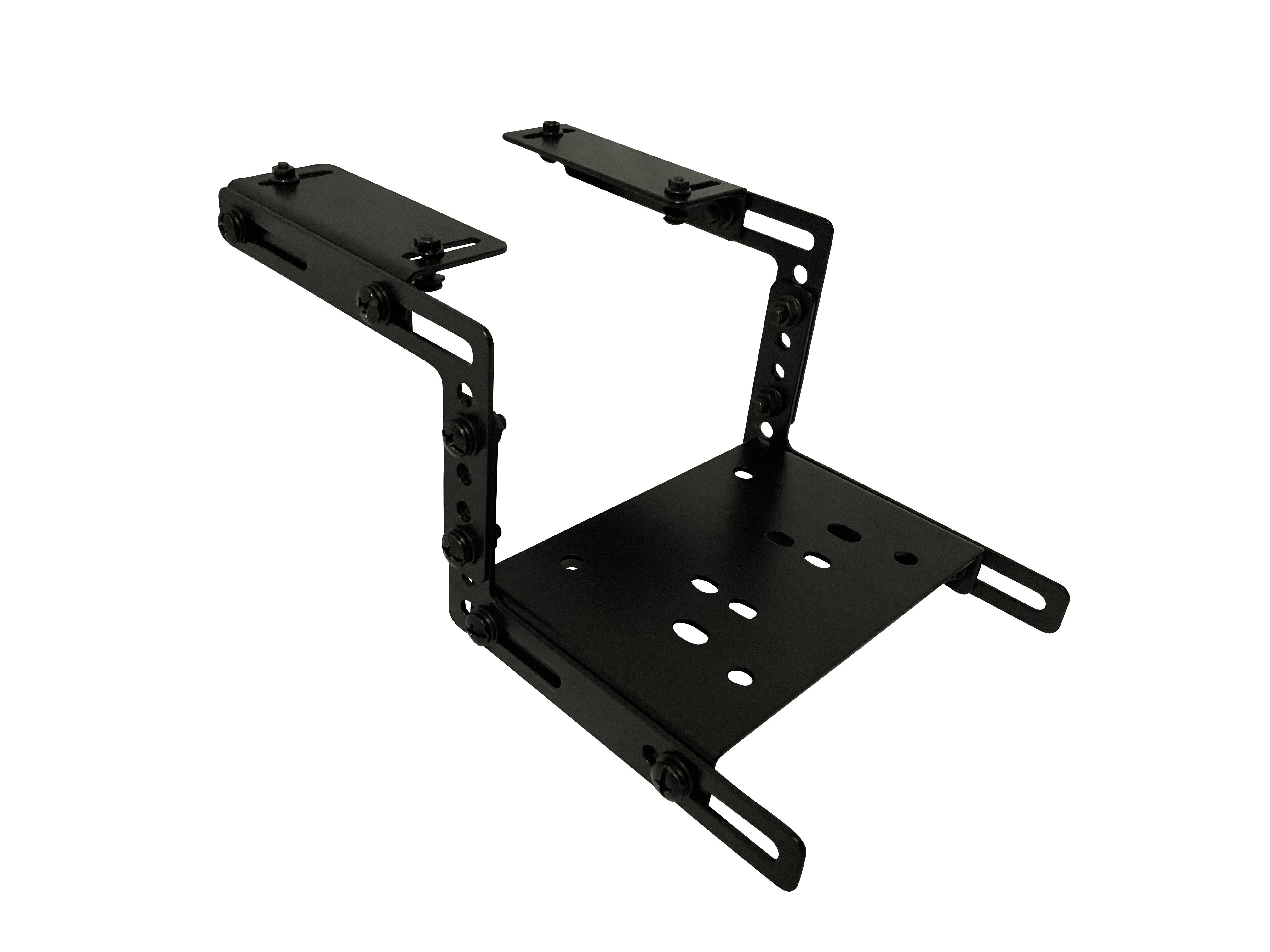 ARCdeskシリーズのパネルには最初から複数の穴が開いているので、ハンドルコントローラーやシフターなどを取り付けることができます。また、既存の穴と一致しないデバイスの場合は、デスクに付属する取付金具を使用して設置できます。