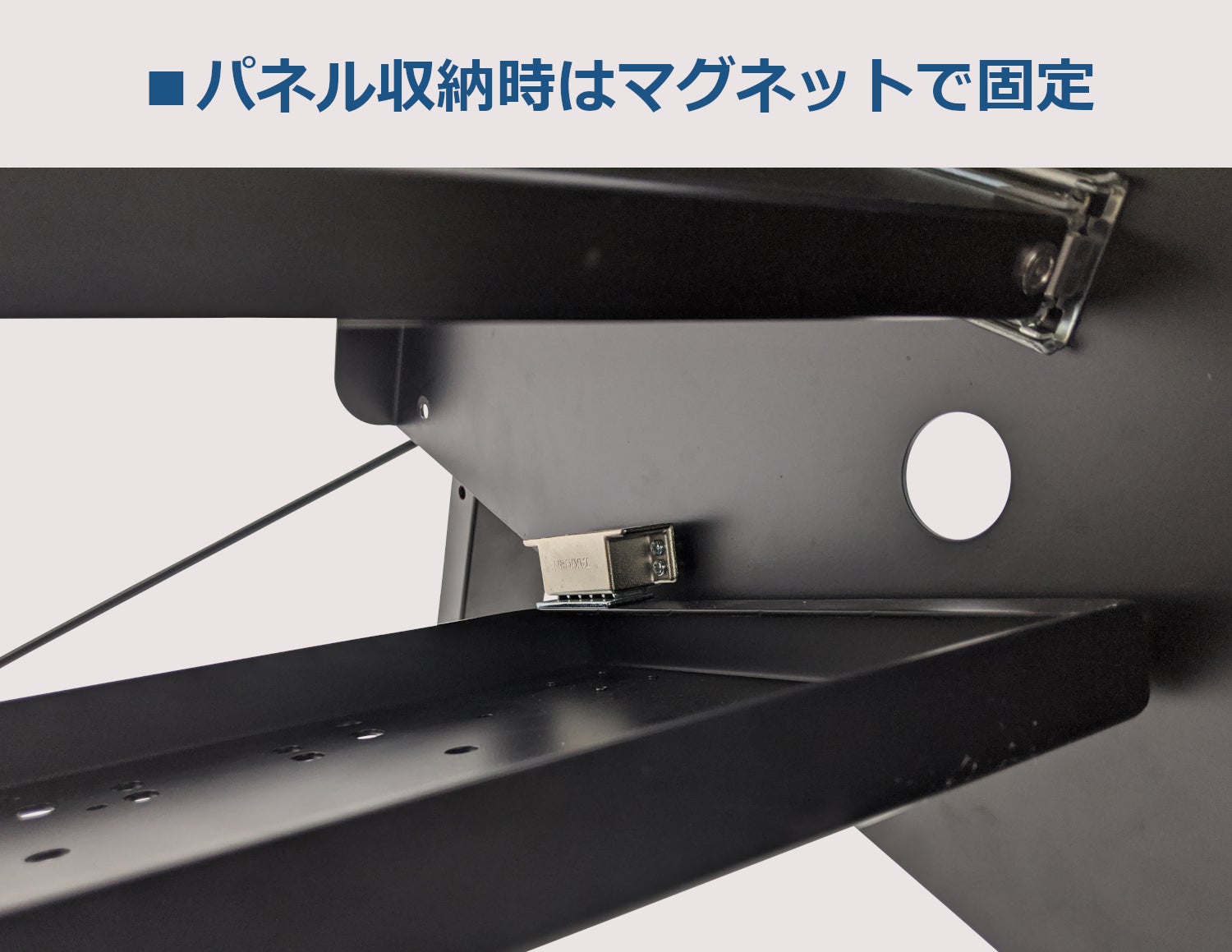 パネルを収納する際は側面の磁石で固定します。強力な磁石なので、耐荷重内であれば落下することはありません。
