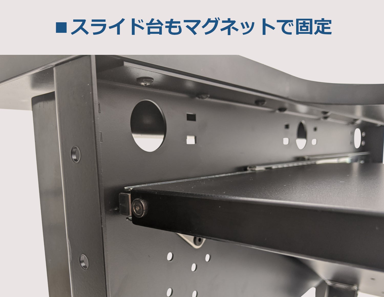スライド台にもマグネットが付いていてサイドパネルに固定できるので、激しいマウス操作でも揺れることがありません。