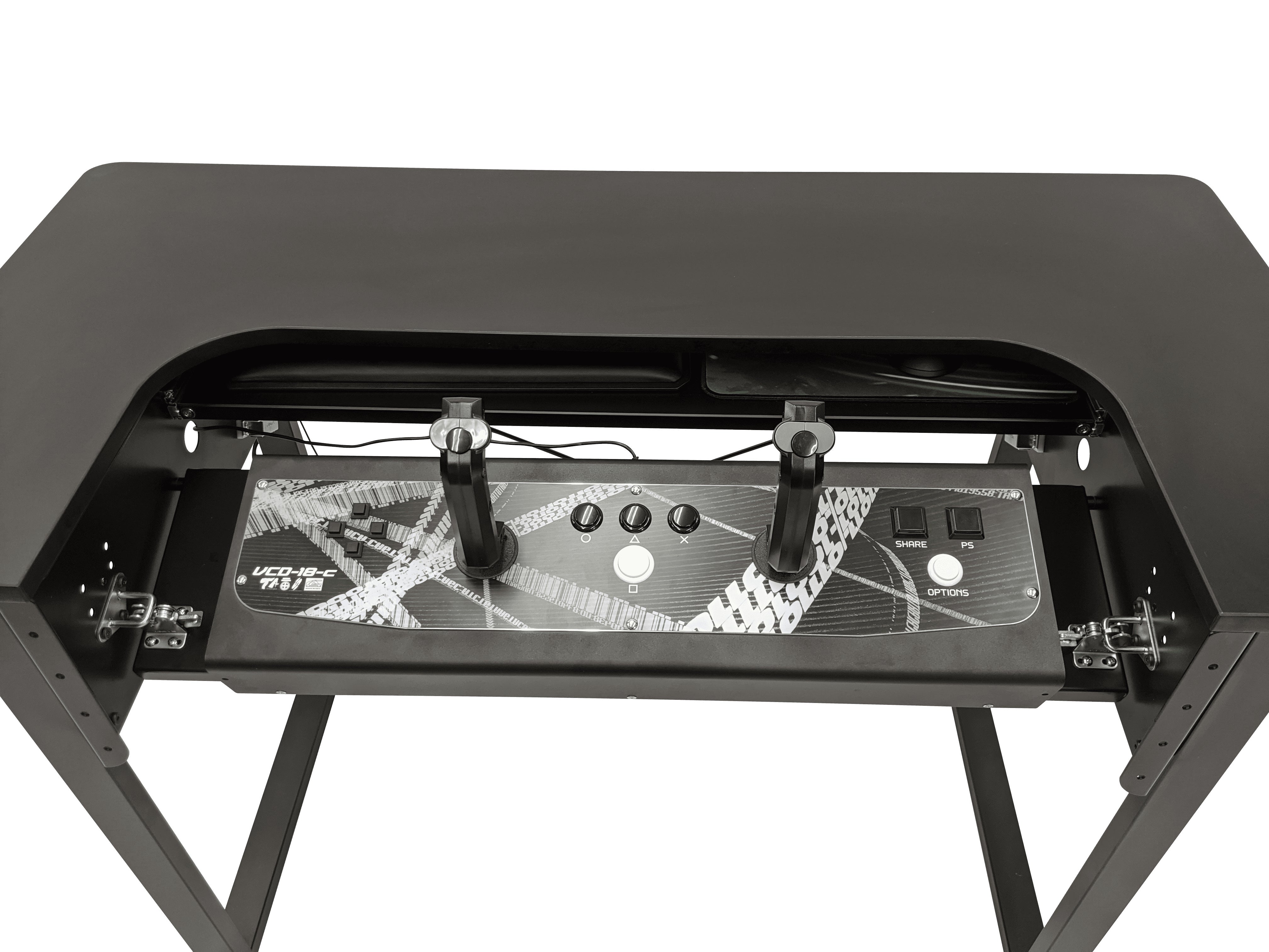 ARCdeskシリーズには、キーボードスペースに加えてハンドルコントローラーなどを設置できる「アークパネル」を搭載しています。