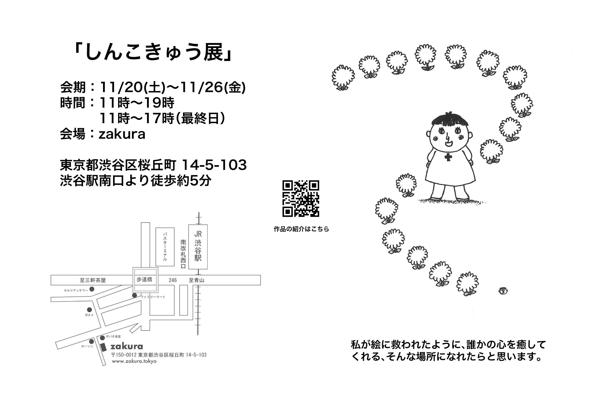 原画14点、作品集「しんこきゅう」、ポストカード9種類、しんこきゅうTシャツが個展では見れますのでお越しいただけたら嬉しいです。