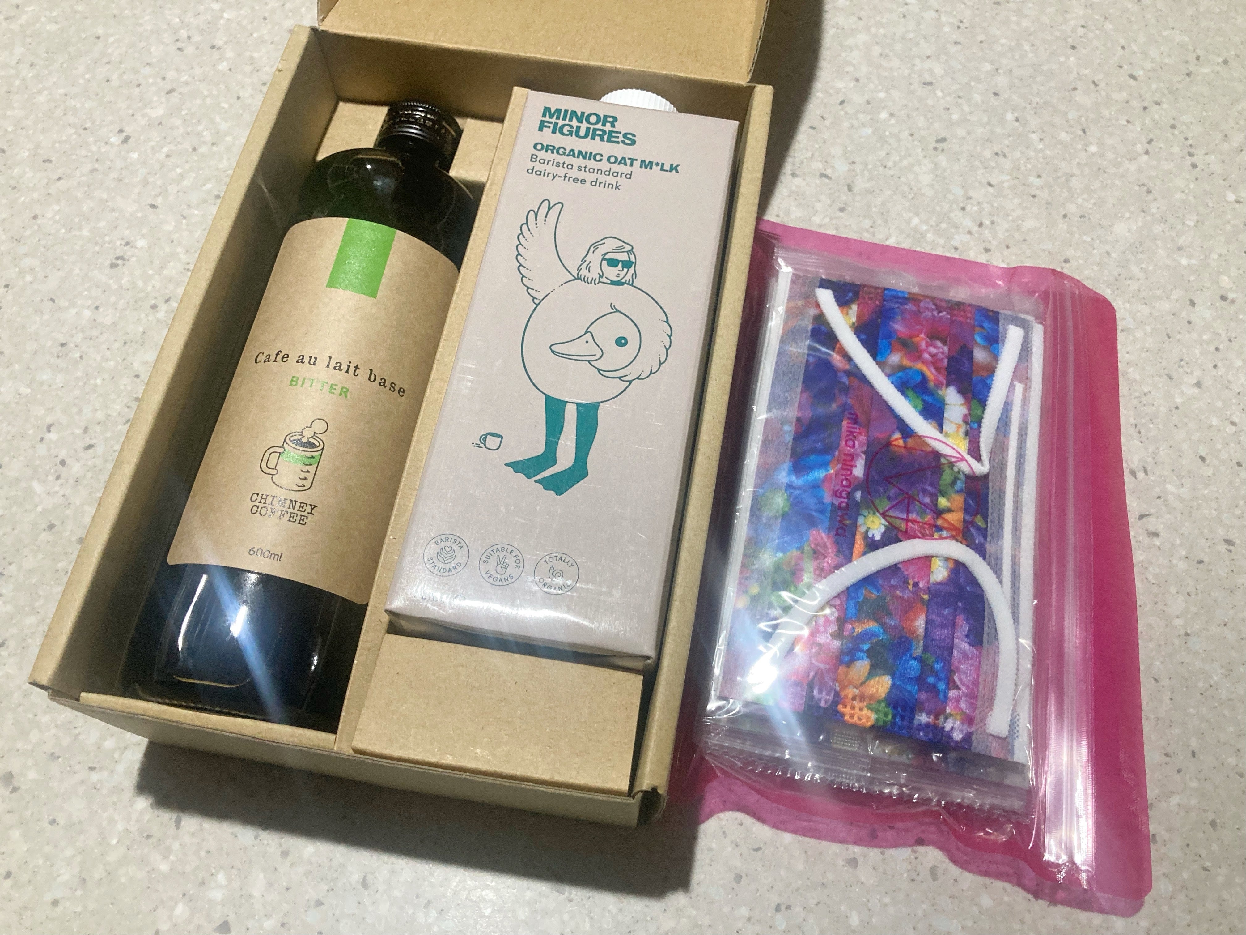 CHIMNEY COFFEEのカフェオレベースを3人分ギフトしてくださる気遣いさも素敵!!美味しいと評判で気になってたので、めちゃくちゃ嬉しかった!!蜷川実花さんのマスクのかわいさにキュン❤︎ 杉本さん、ありがとうございました(^_^)