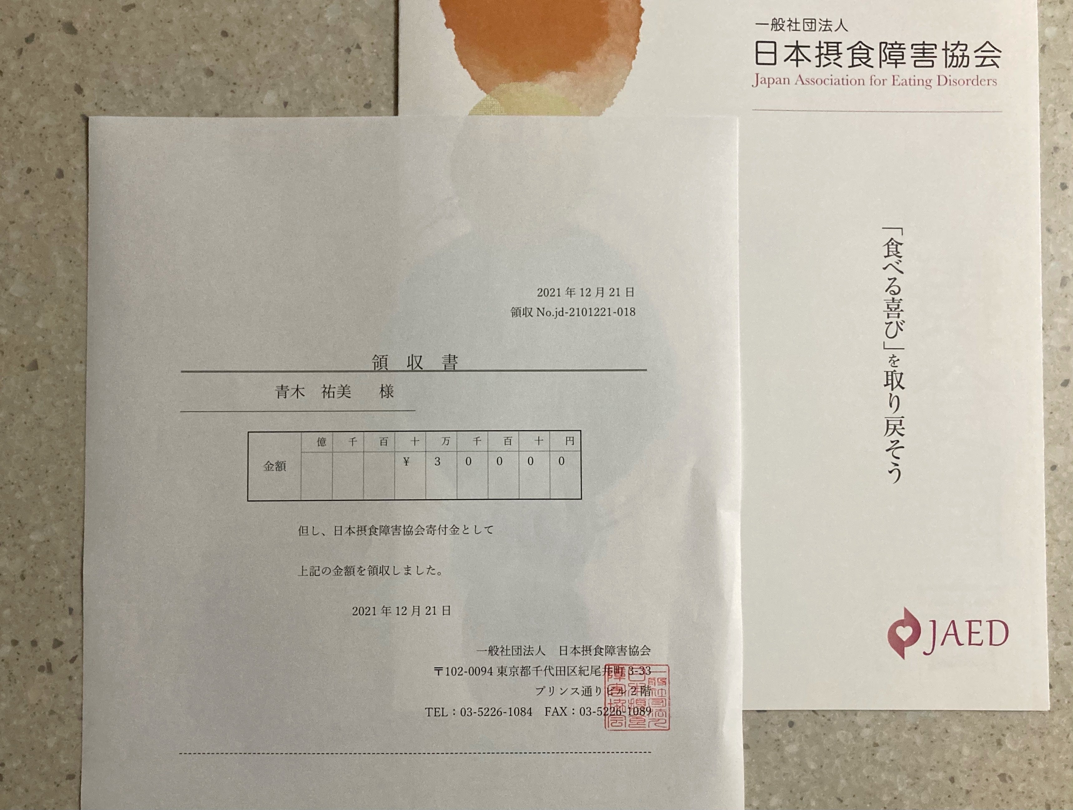 一般社団法人 日本摂食障害協会の方に30,000円寄付させていただきました。