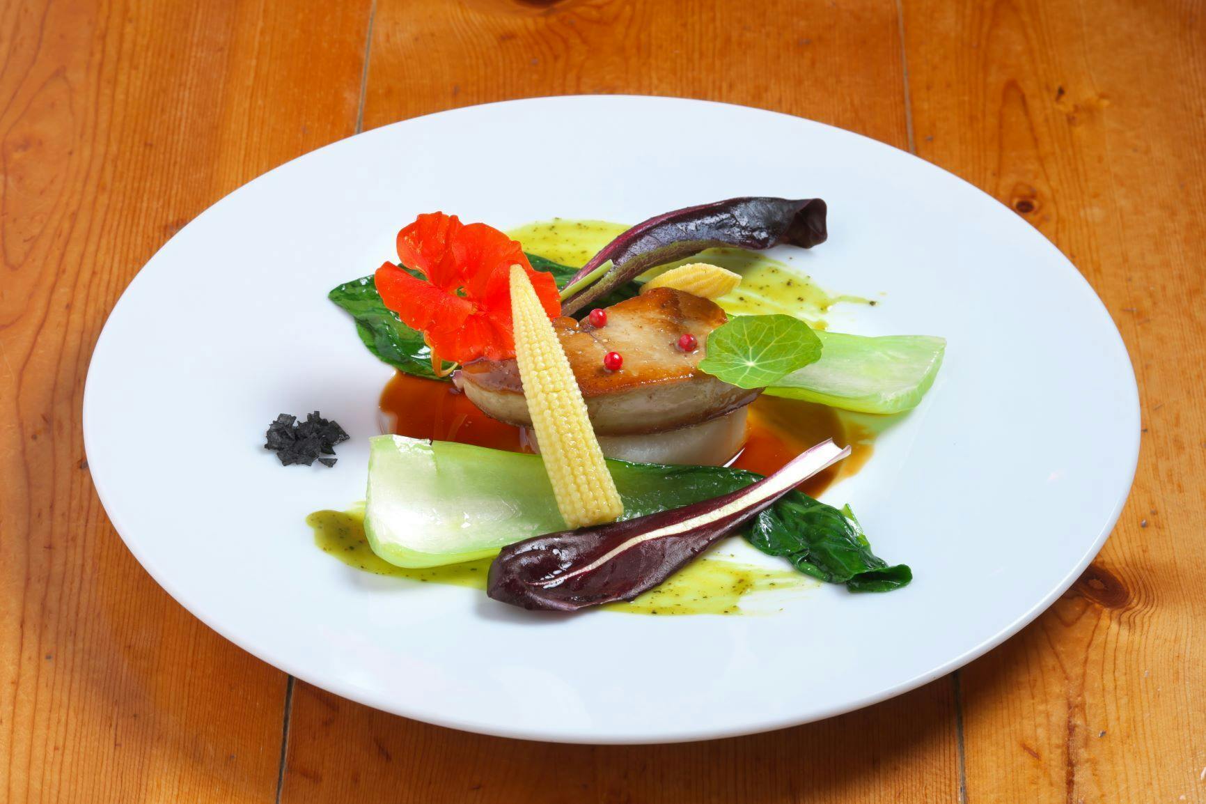 活けオマール海老とスズキのポワレ ソースアメリケーヌとトマト 海のエキューム添え