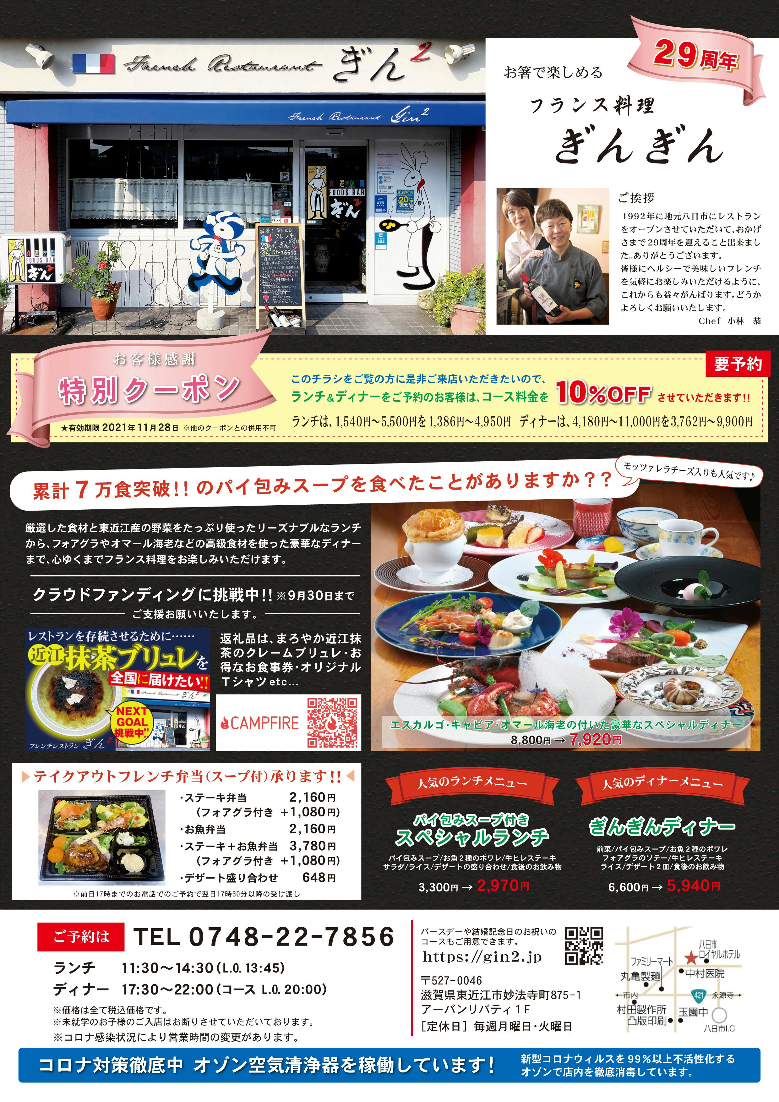 緊急事態宣言もようやく明日解除となりますので、沢山のご支援をいただいた御礼として、そして29周年の感謝を込めて、11月28日まで、ランチ&ディナーのコースを10%割引させていただきます。