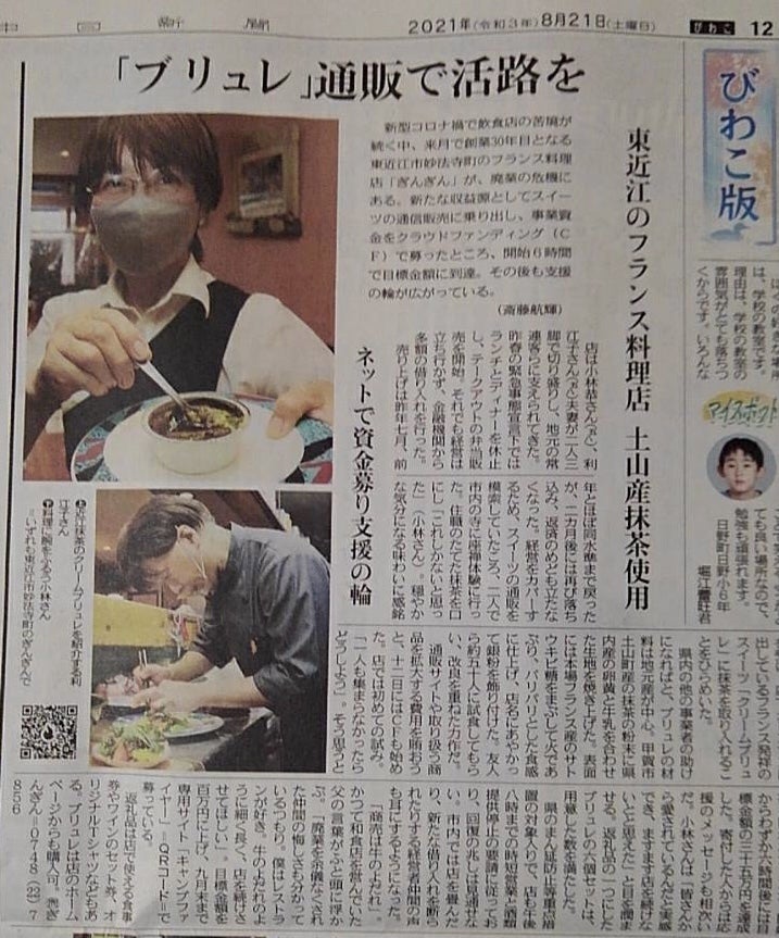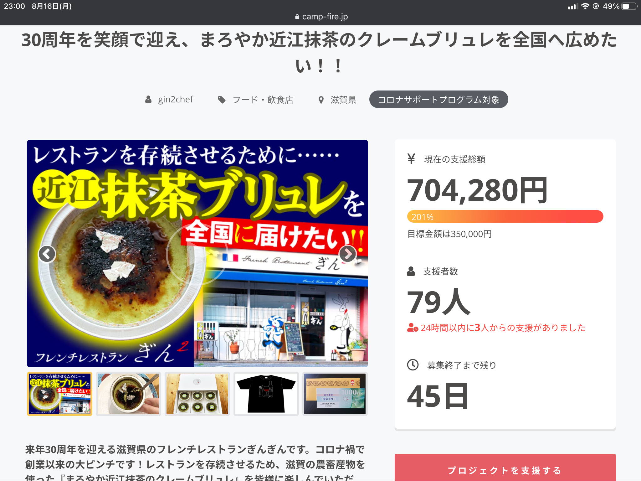 おかげさまで、NEXT GOAL の目標金額100万円を達成することが出来ました!!ご支援いただいた皆さま、ありがとうございますm(_ _)m滋賀県にも緊急事態宣言が発令され、非常に厳しいレストラン経営を余儀なくされておりますが、毎日沢山の方々からのご支援をいただき、本当に励まされ、パワーをいただいております。飲食店経営者仲間や懐かしいお客様が激励にお店に来てくれたり、メッセージしていただいたりと、嬉しくて涙が溢れます。9月13日以降制限が解除される事を祈りつつ、日々仕事をしています。最終日まで、あと26日。NEXT GOALを135万円にして、最後まで全力でご支援のお願いを続けさせていただきます。お友達の方にも是非ご紹介いただけたらとても助かります。どうか、よろしくお願い致します。フランス料理ぎんぎん店主 小林 恭