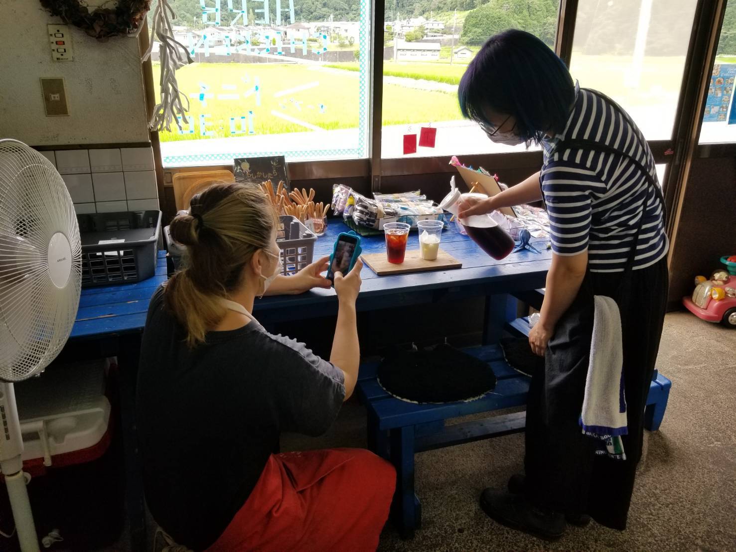 ↑左がmiho、右がFuuさんです。新メニューの水出し珈琲の動画を撮っているところです。