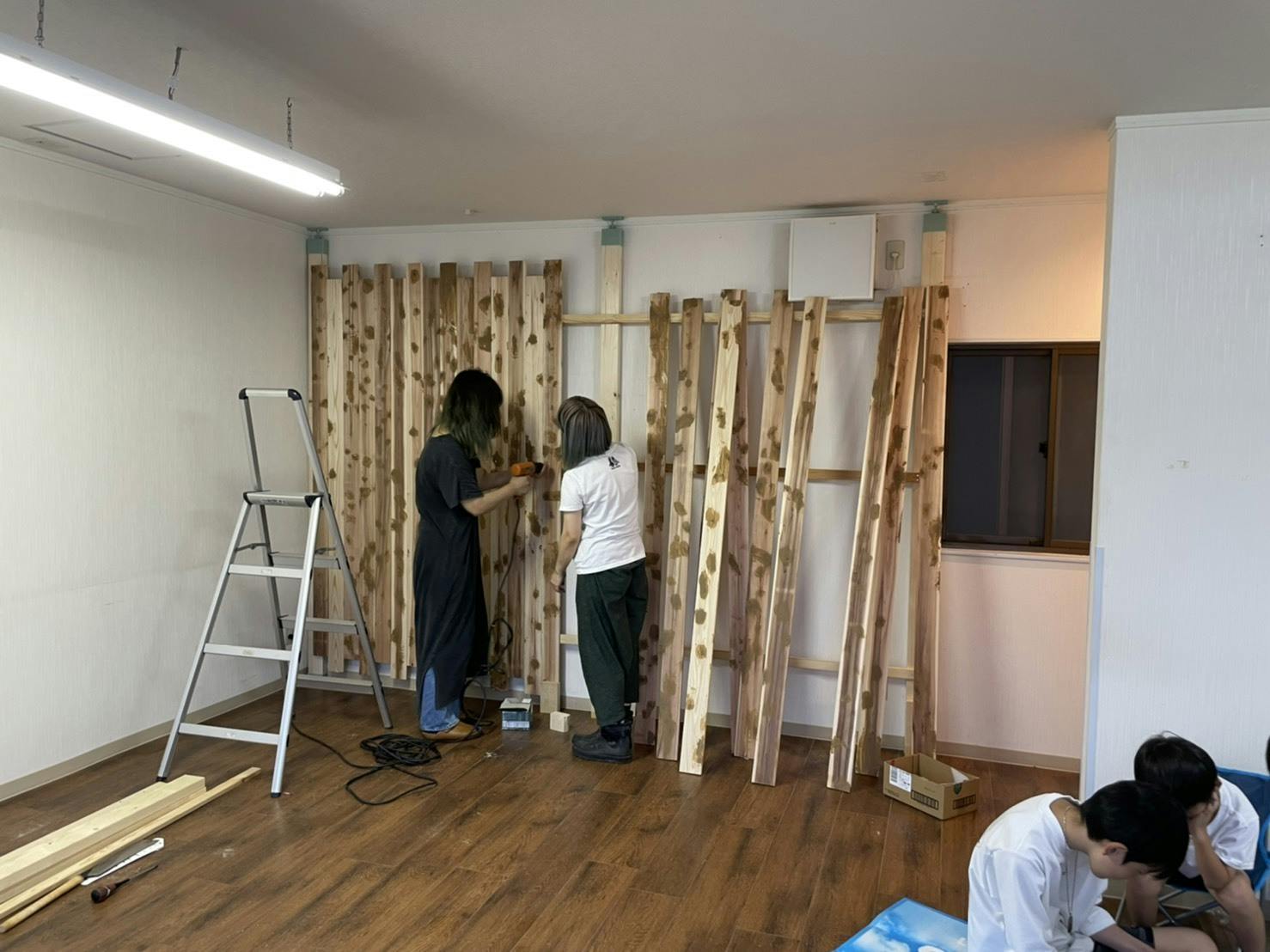 Fuuさんの旦那さまも手伝ってくださり、私の息子も初めてインパクトを使わせてもらい、壁面が半分完成しました。