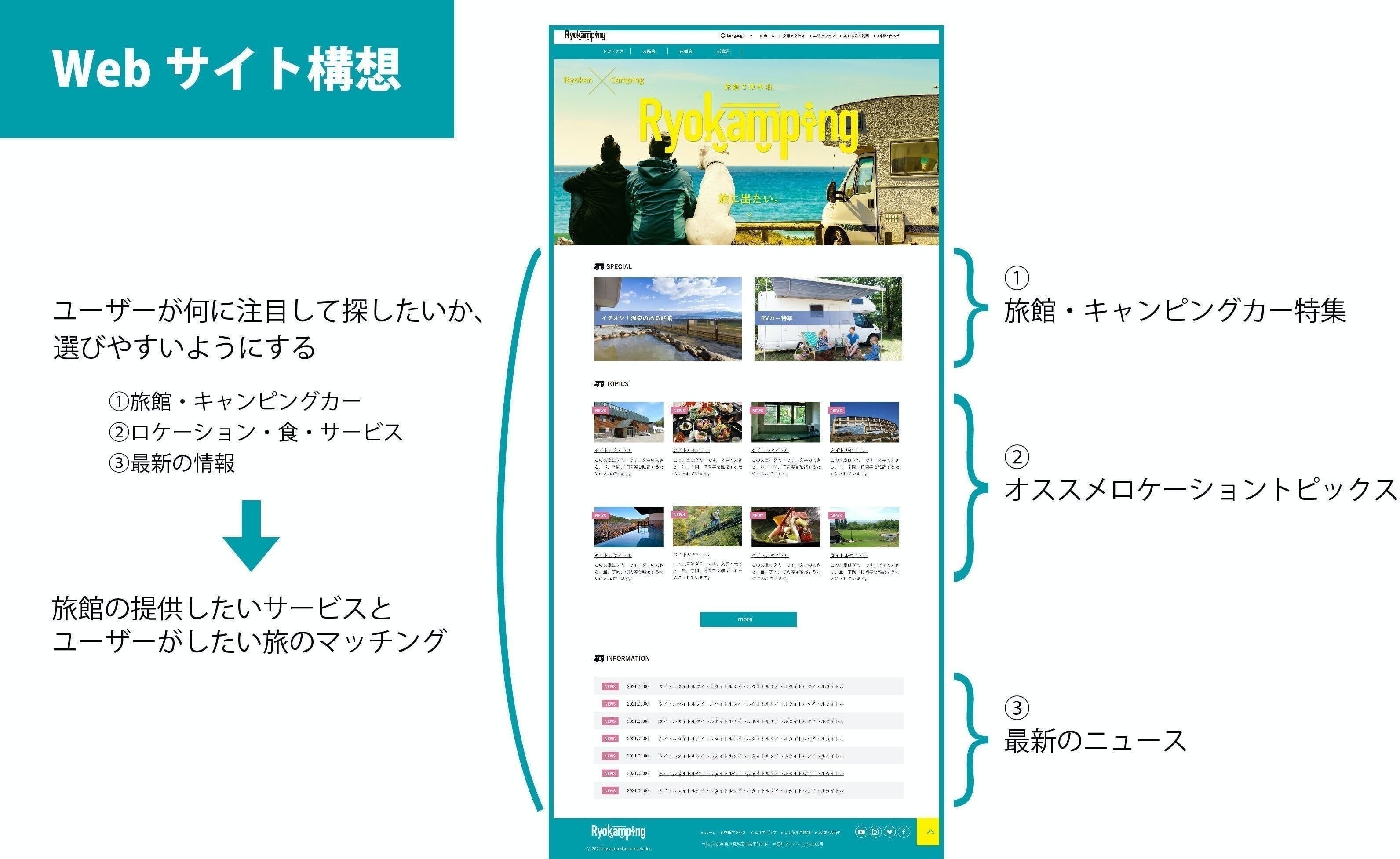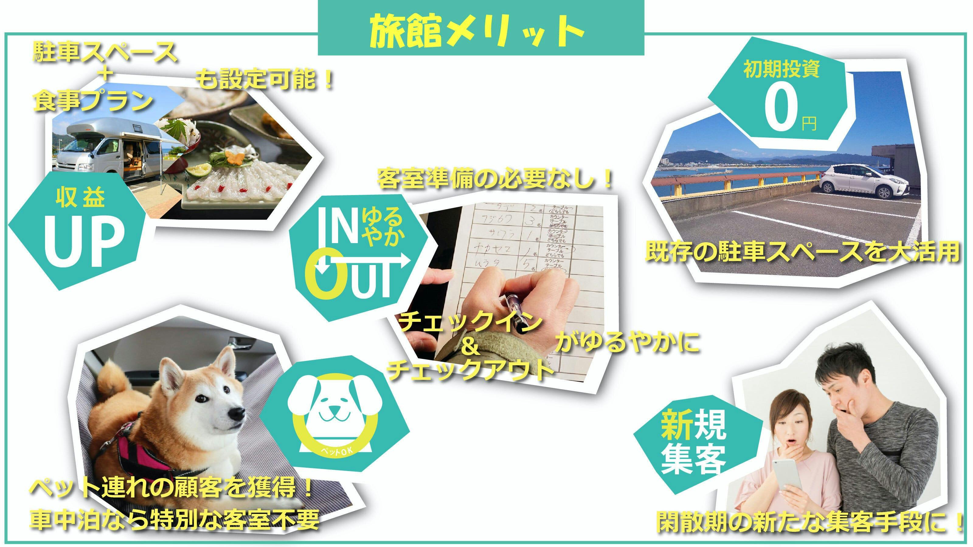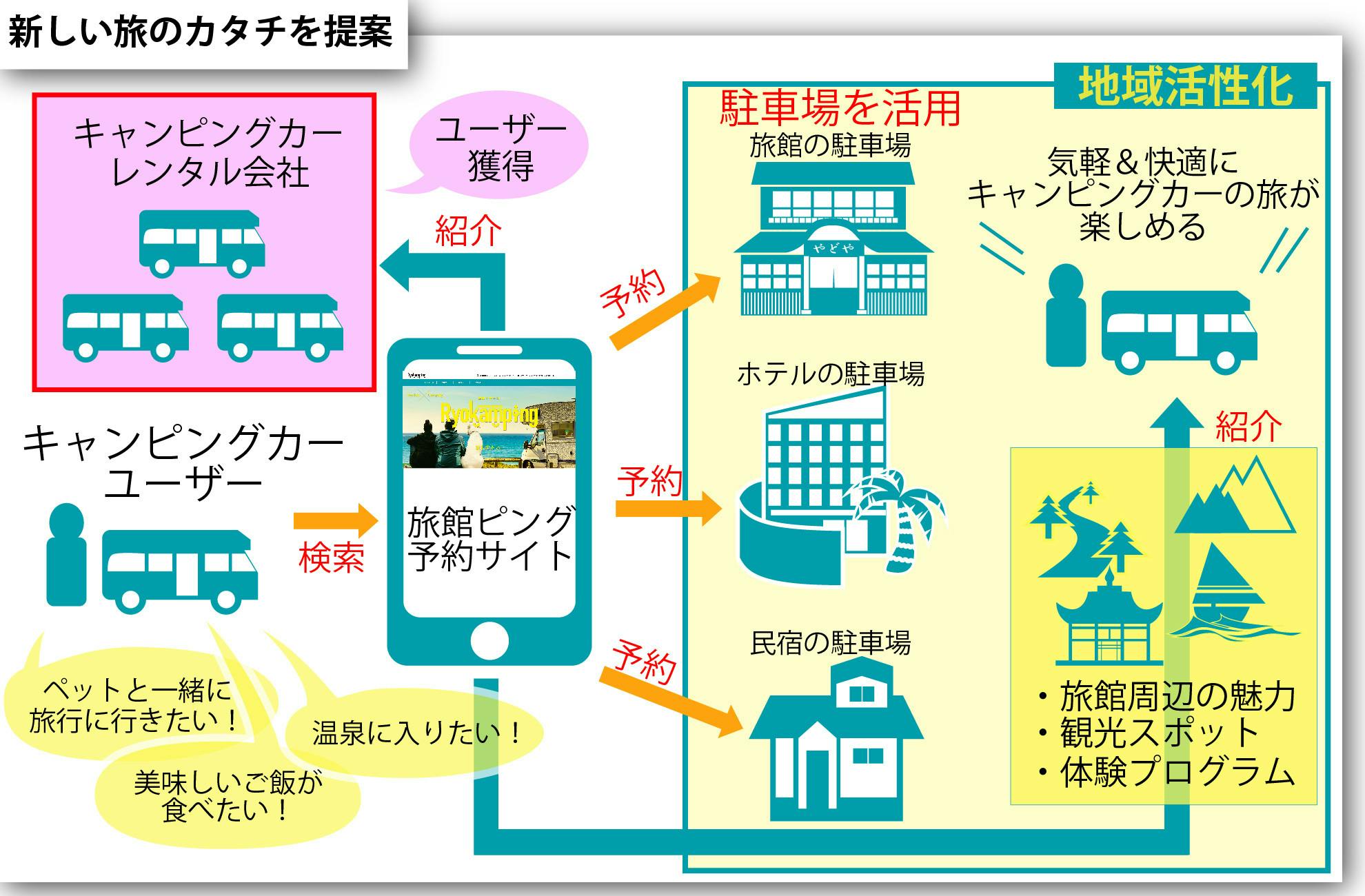 キャンピングカーの醍醐味は「車で楽しく寝泊まりできる」ことですが、実はその「車中泊」が許可された駐車場は少数。だったら旅館さんの駐車場で泊まれるようにしたらいい、私たちはその予約サイトを制作・運営しよう! と考えたのです。サービス名は、旅館×キャンピングカーで旅館ピングです。