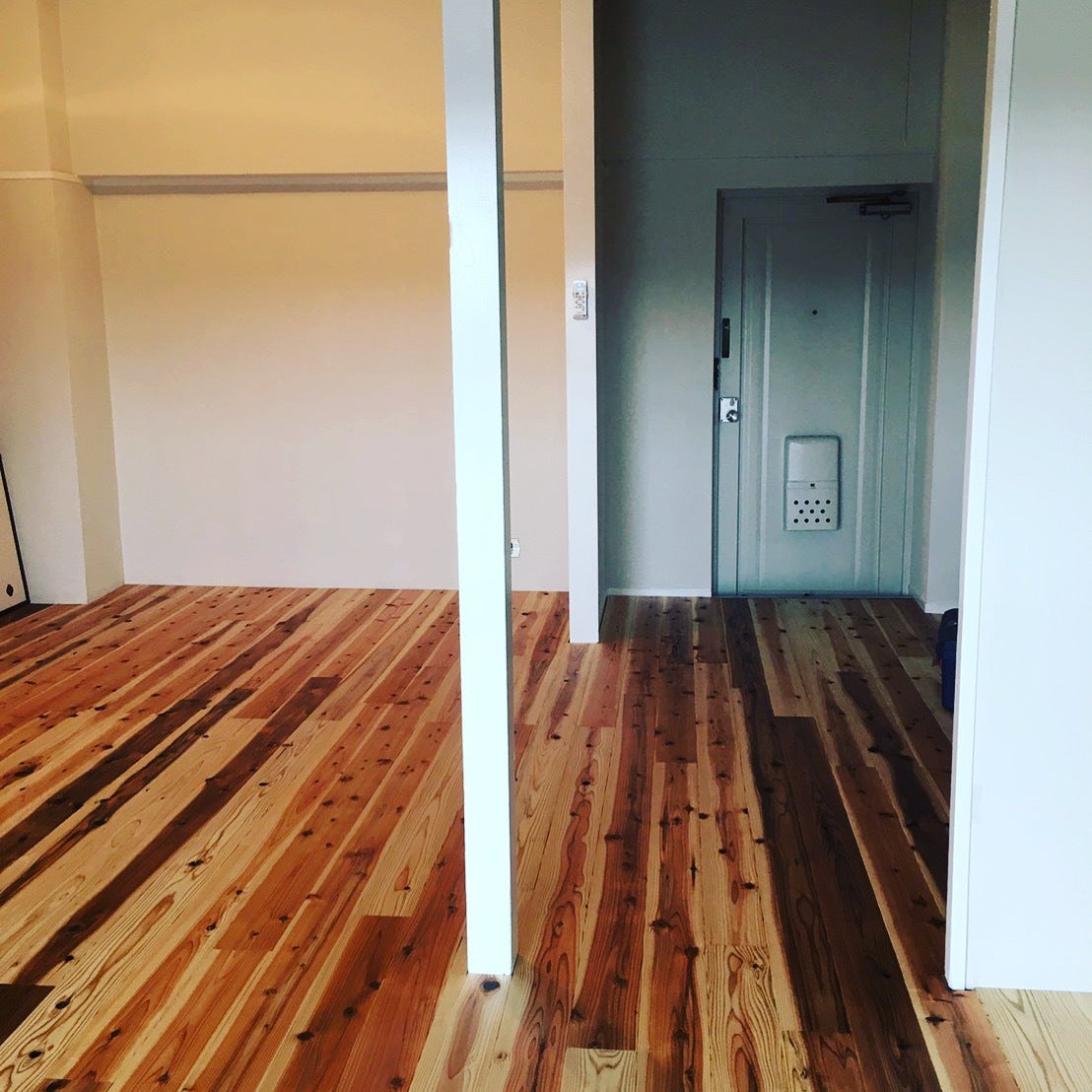 2021/07/27 17:30壁の撤去から杉のフロア張りまでです。床は仕上げにミツロウを塗っています。木部の茶色い部分を白のペンキで潰しています。なるべく見切り部分を少なくする事で広く開放的な空間が仕上げられます。 もっと見る