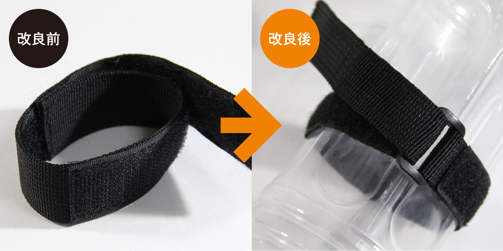 新タイプは樹脂バックルを追加。テープを通すことで締付固定ができるようになりました。また、マジックテープ裏側に滑り止め生地を追加し、ストラップからのずり落ちを抑える工夫をしました。