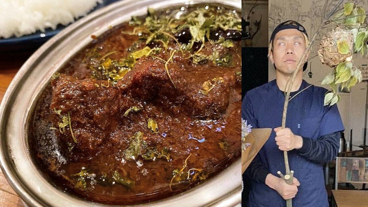 店主・カレーの紹介:某マンガのキャラクター似の店主が作る他にはない創作カレーは多くのファンを魅了。贅沢に盛り付けられたカレーや副菜は、まずは一つ一つを味わい、それから少しずつ組み合わせて食べるスタイル。