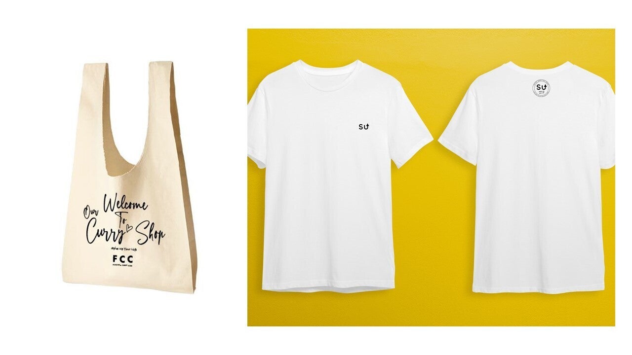 各カレー店がこのプロジェクトのために準備したひと皿と福岡カレードットコムのロゴ入りのグッズをご用意しました。