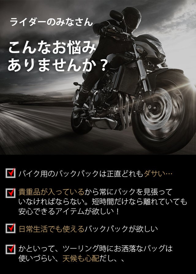 スリム設計・撥水、防犯機能付きバックパックは、ライダーにはもちろん、普段バイクに乗らない方も満足してご使用いただけます!