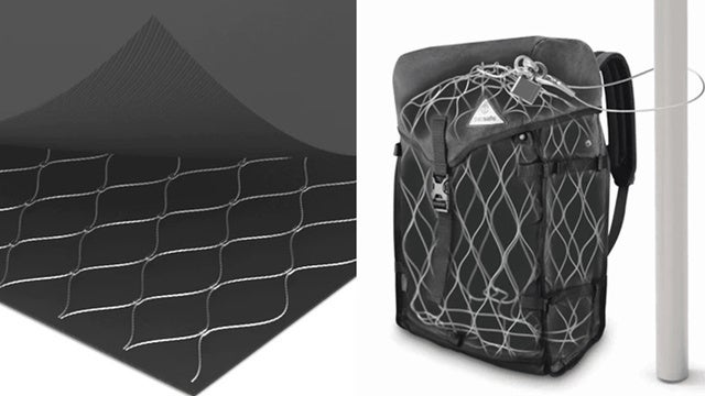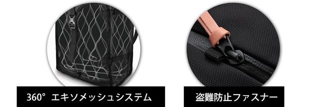 バッグ生地全体には、ステンレスワイヤー(360°Xomesh(エキソメッシュ))が埋め込まれているため鋭利な刃物等でも簡単には切り裂けられず、バックパック自体が簡易金庫のような役割を担います。