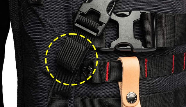 バックパックの背面やショルダーストラップ部には、カラビナやペンなど、様々なアクセサリーを外付けすることができるウェビングストラップが施されています。