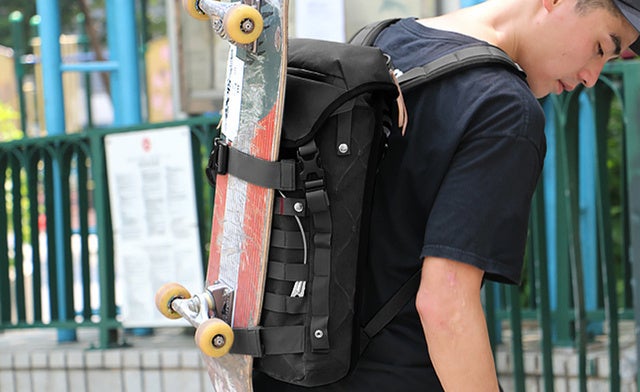 バックパックには入りきらないスケートボードや三脚などの大きな物をしっかりと固定してくれるので、新たにもう一つ大きな鞄を用意する必要なく必要最低限の荷物で移動することができます。