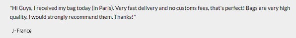 みなさんこんにちは、今日パリでバッグを受け取りました。迅速な配達と通関手数料なしで完璧です!非常に高品質なバッグです。皆さんに強くお勧めします。ありがとう!