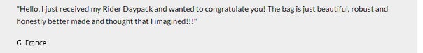 こんにちは。先ほどThe Rider Daypackを受け取りました。そして、あなたを祝福したいと思いました!美しい見た目で、丈夫、本当に良く作られており私の想像通りでした!!!