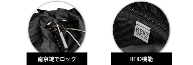 動かないポール等にワイヤーと南京錠を使って固定しておくと置引の心配もなく、口もしっかりと締めているため中身を盗られることも防ぎます。RFID機能もあるので、スキミングされる心配もありません。身軽に席を離れることができます。