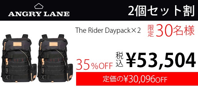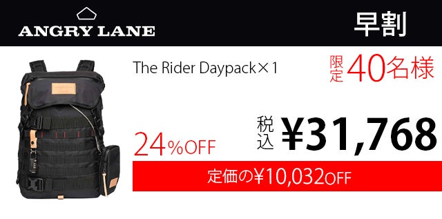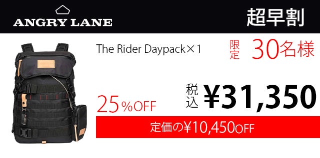 ANGRY LANEはアメリカのクラウドファンディングサイトKicstarterとIndiegogoで累計約570万円、584人から支援を集めるに至りました。今回は、The Rider Daypack日本初上陸キャンペーン第二弾!
