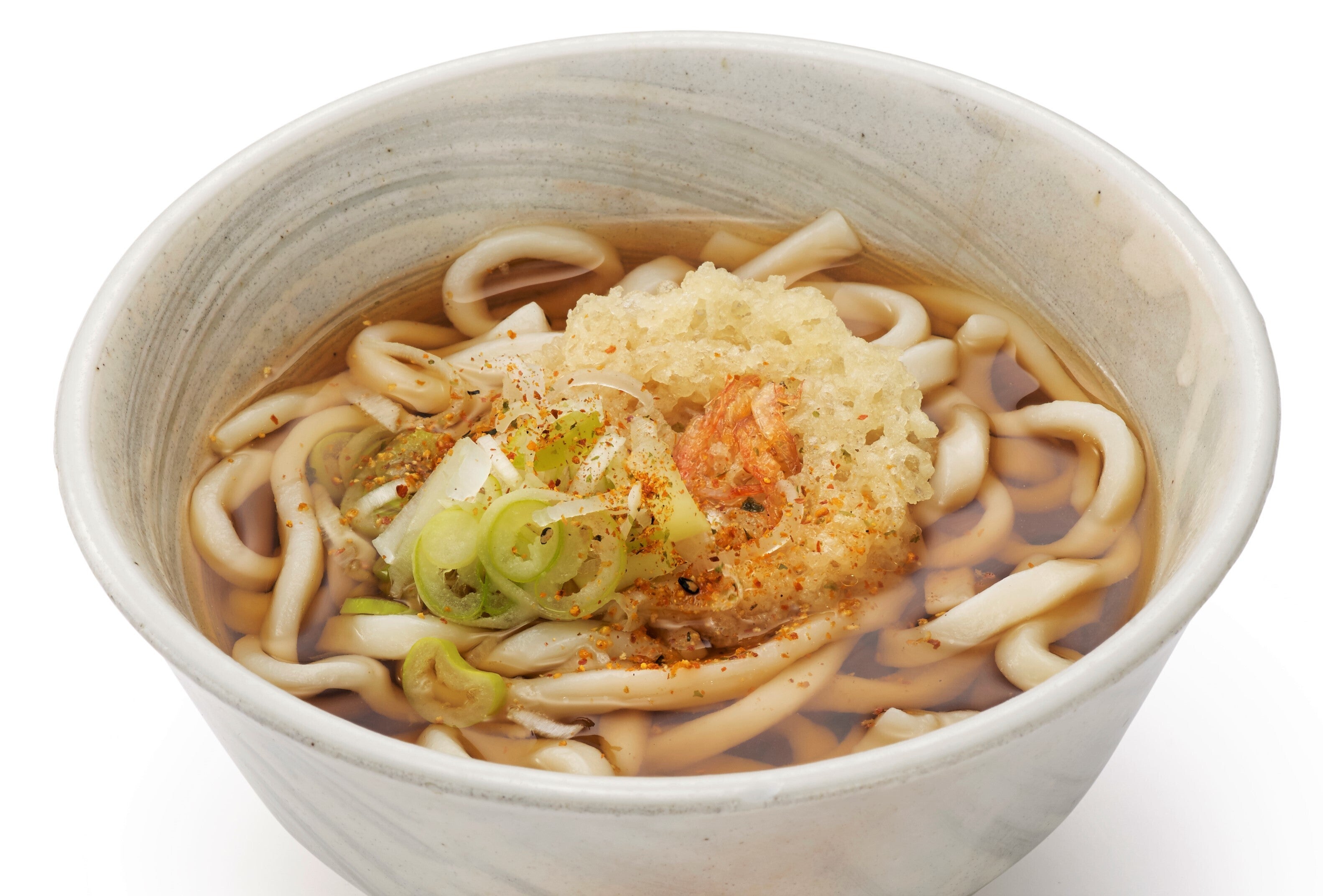 手間を惜しまない丁寧な手仕事が生み出す深い味わいと、創業当時から変わらないレトロなパッケージが目印の天ぷらうどんは、自家製の天ぷら・つゆ・七味唐辛子がセットになっています。
