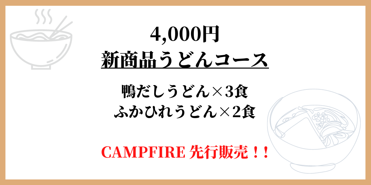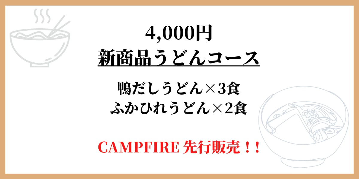 こちらは平打ち麺ですが、太すぎずのど越しの良いうどんです。またスープは、香ばしくて旨味抜群のふかひれ&鴨出汁の2種類でご用意しました。 一般販売に先駆けて、CAMPFIREで先行販売します!