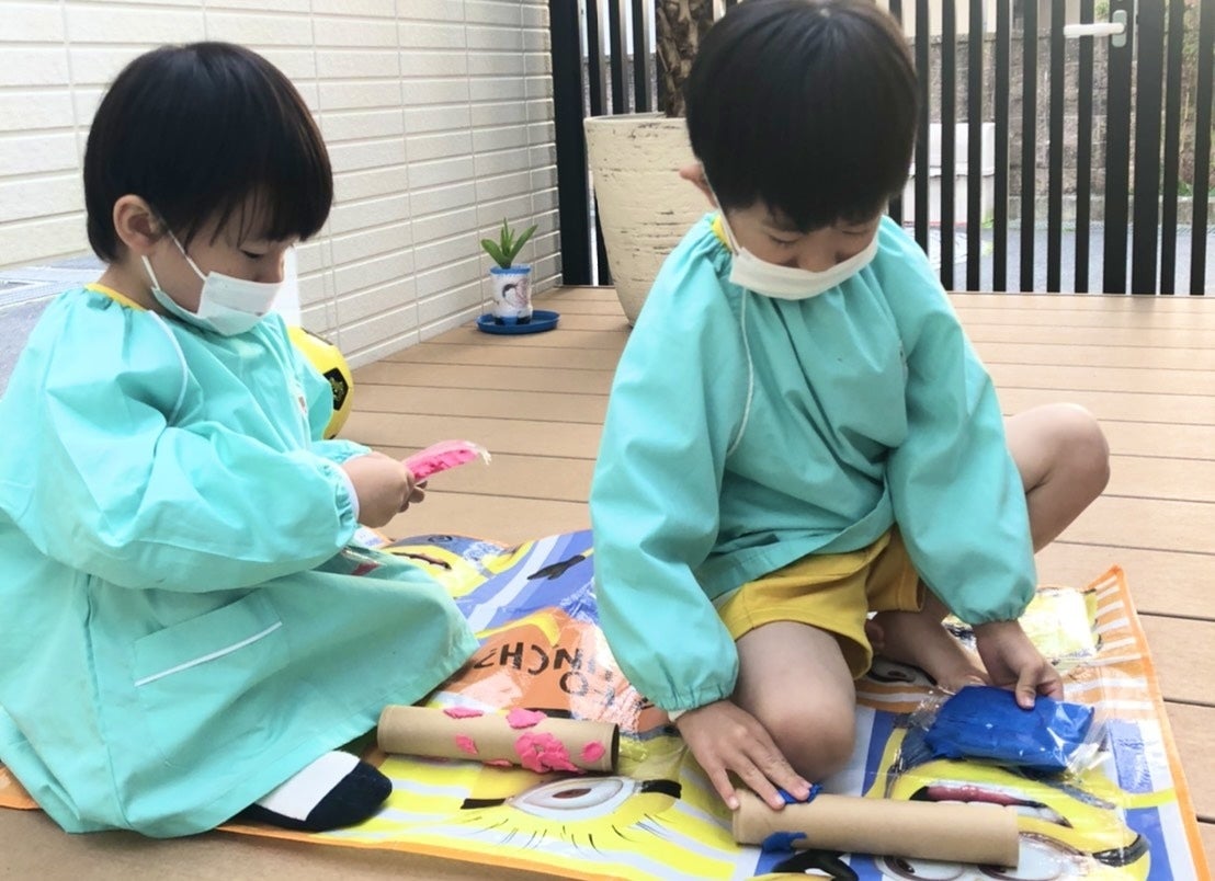 万華鏡に粘土を貼ったり、描いた絵を貼ったり、オリジナルティーがうまれます。(写真は実際に3・4歳児が作成している所です。)