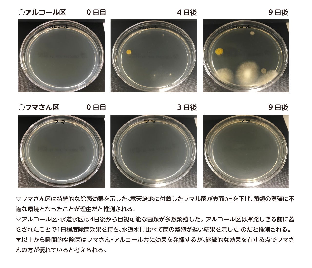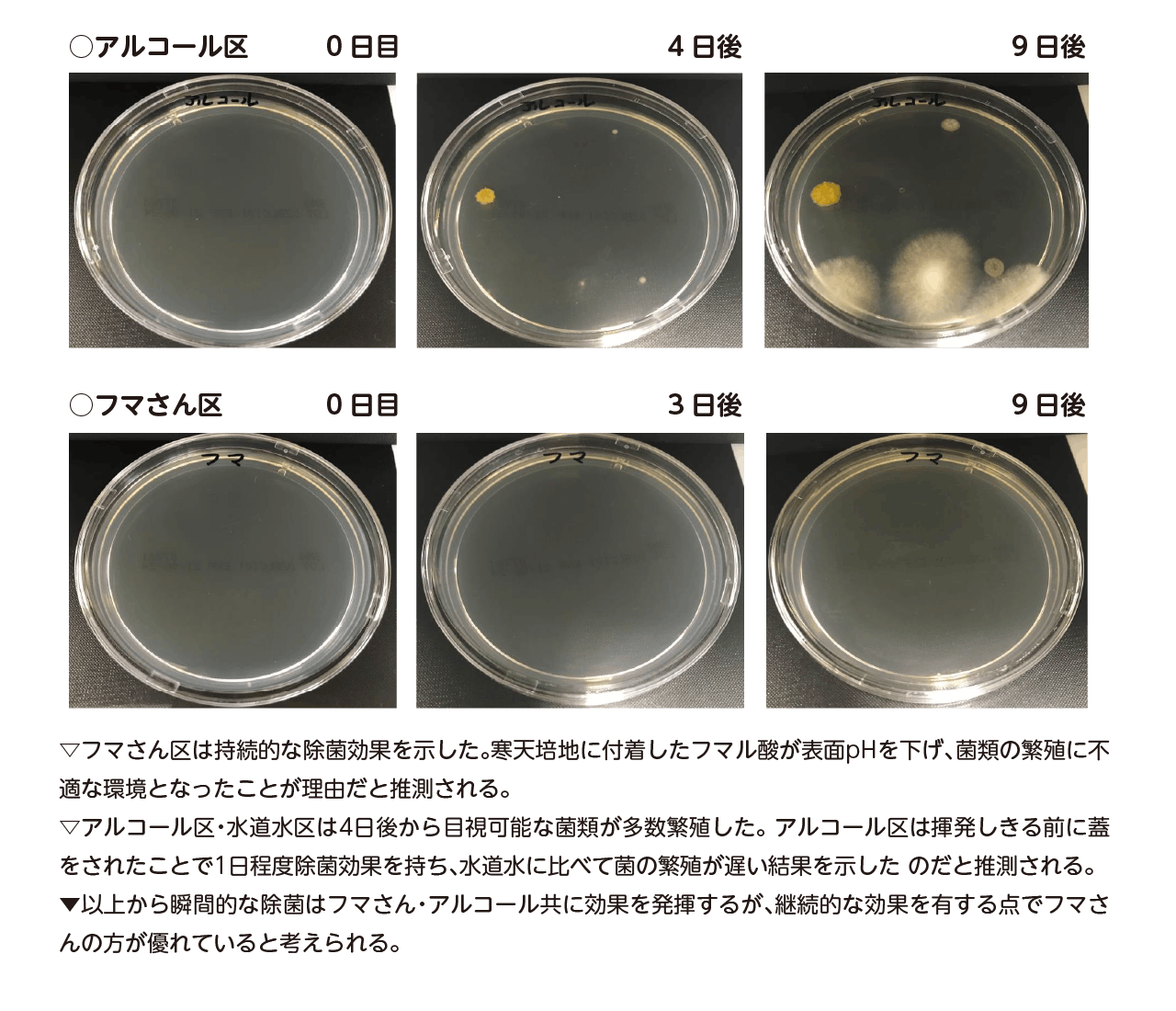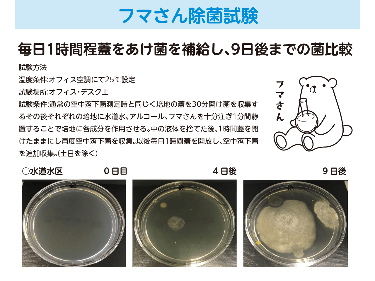 寒天培地にフマさんと他比較を十分噴霧し、各液を十分乾燥させた後フタをした。対象区ではフタをするまでに培地へ落下したカビや黄色ブドウ球菌が増殖したものの、フマさん処理区は菌類が繁殖しなかったので持続性除菌能力を有することが示された。