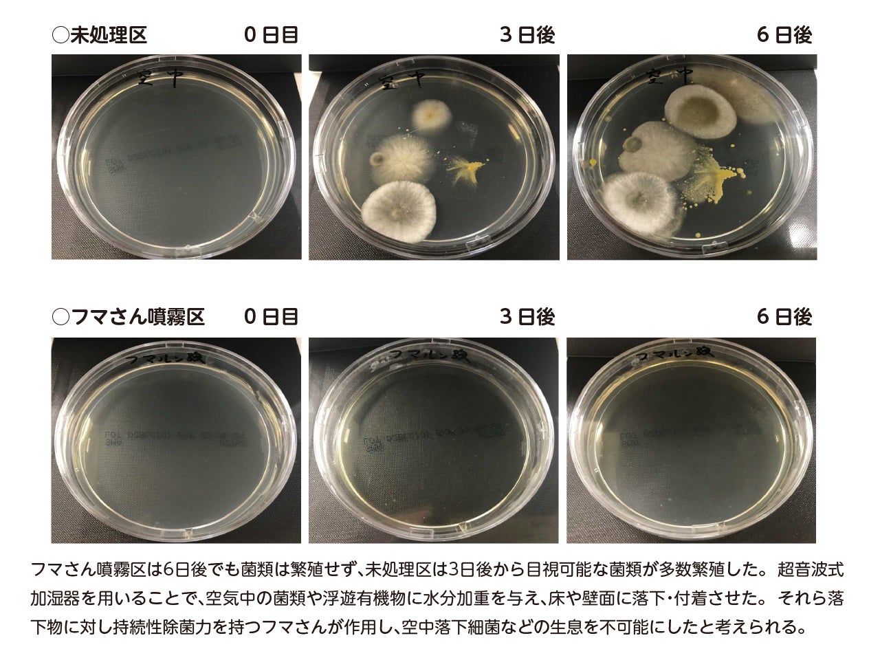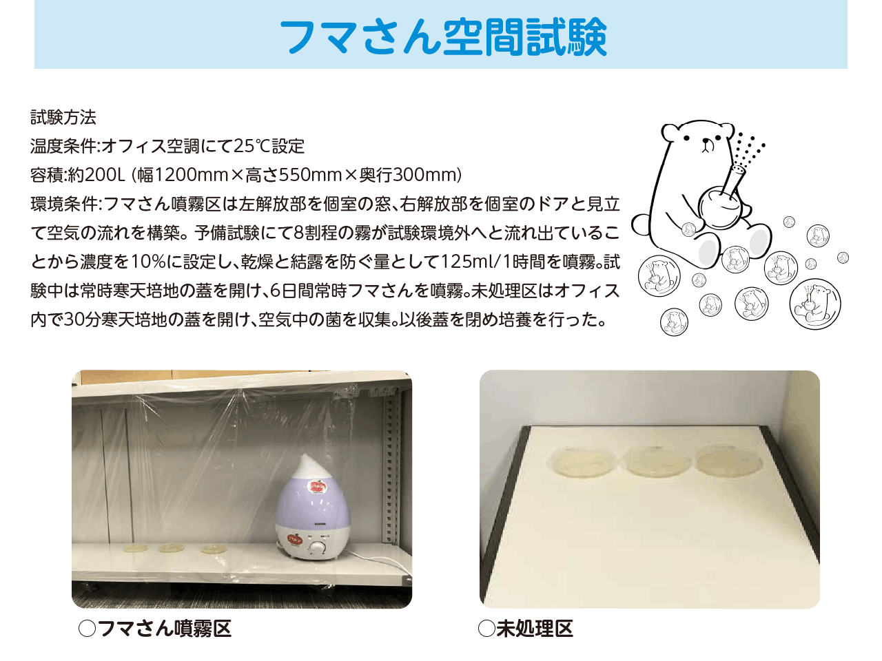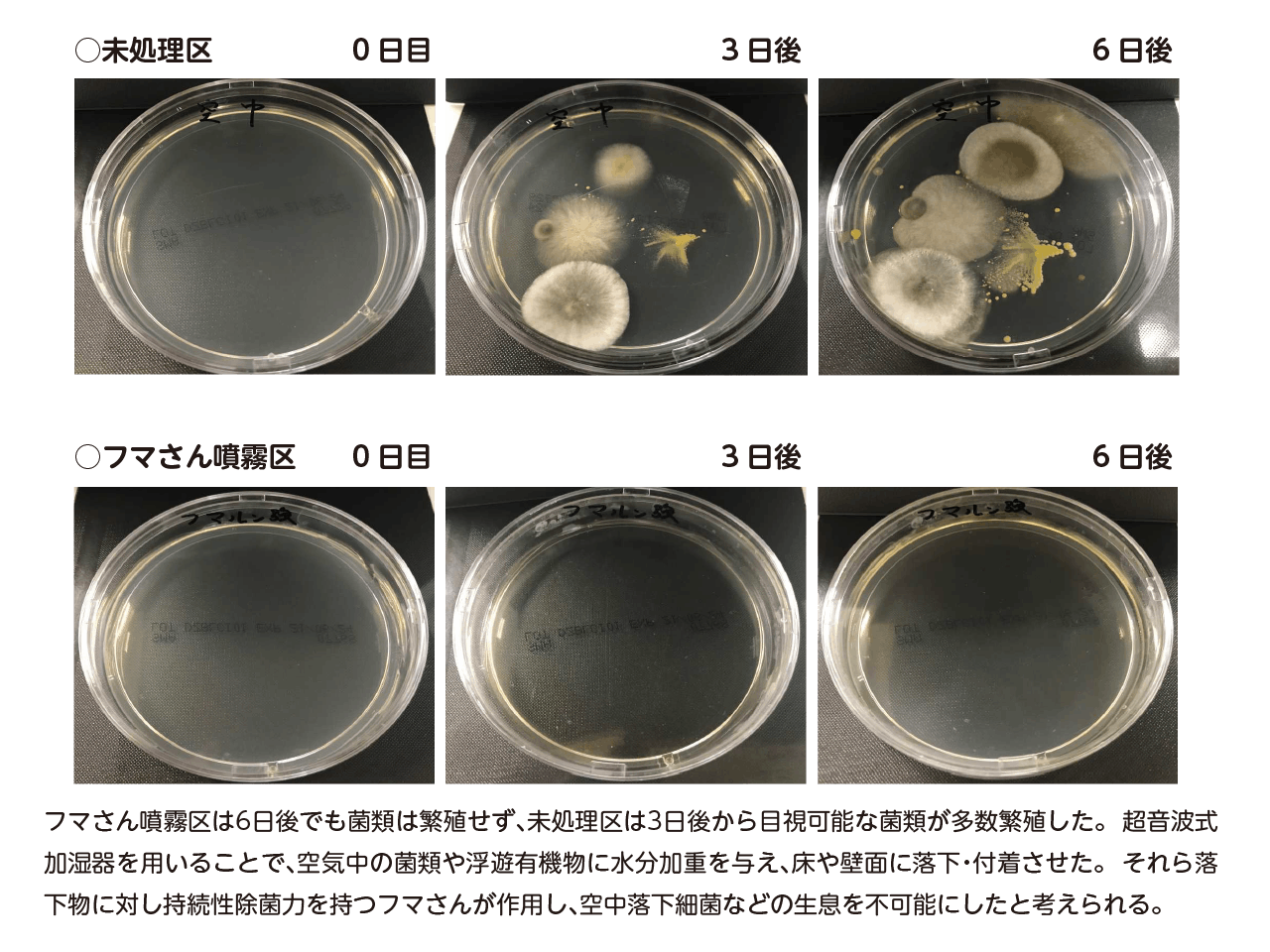 フタをあけた寒天培地に対し、加湿器にてフマさんならびに水を試験期間中連続噴霧。無処理区は30分蓋を開放し、蓋を閉めた後6日間静置。フマさんを噴霧した場合は培地へ落下したカビや黄色ブドウ球菌を除菌・抑制することが示された。