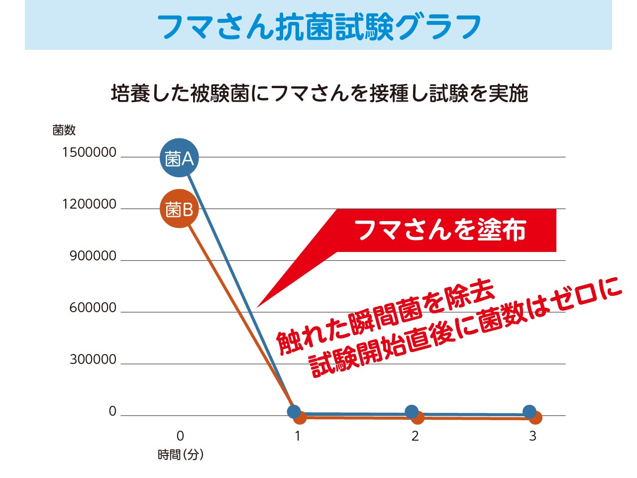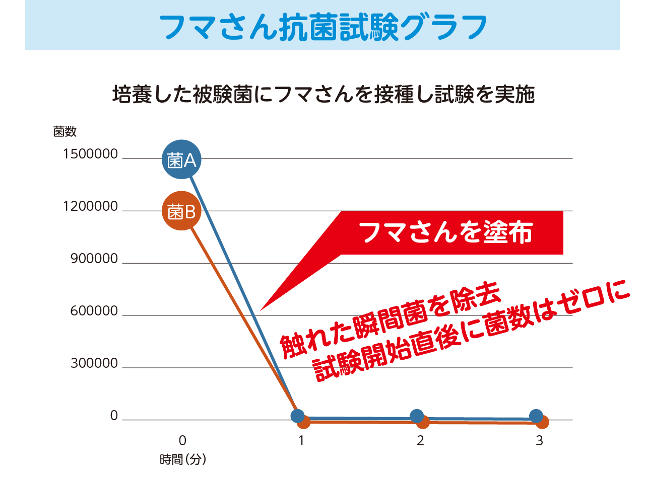 1,000,000/ml以上の菌数液に対しフマさんを接種即時・30秒・1分・2分・3分作用させ、その後寒天培地に塗布し培養。およそ20時間後の菌数を測定した結果、フマさんは接種直後に除菌効果を発揮したことが示された。