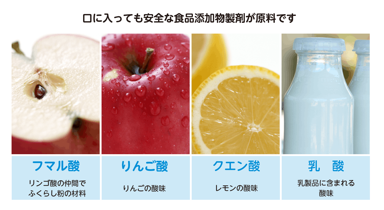 「食品添加物と同じ成分」で「体内でも生成される」フマル酸を使用した、水溶液で安全性能&効果の高い除菌液をお手元に。アルコール刺激が苦手な方にも安心して利用いただけます。