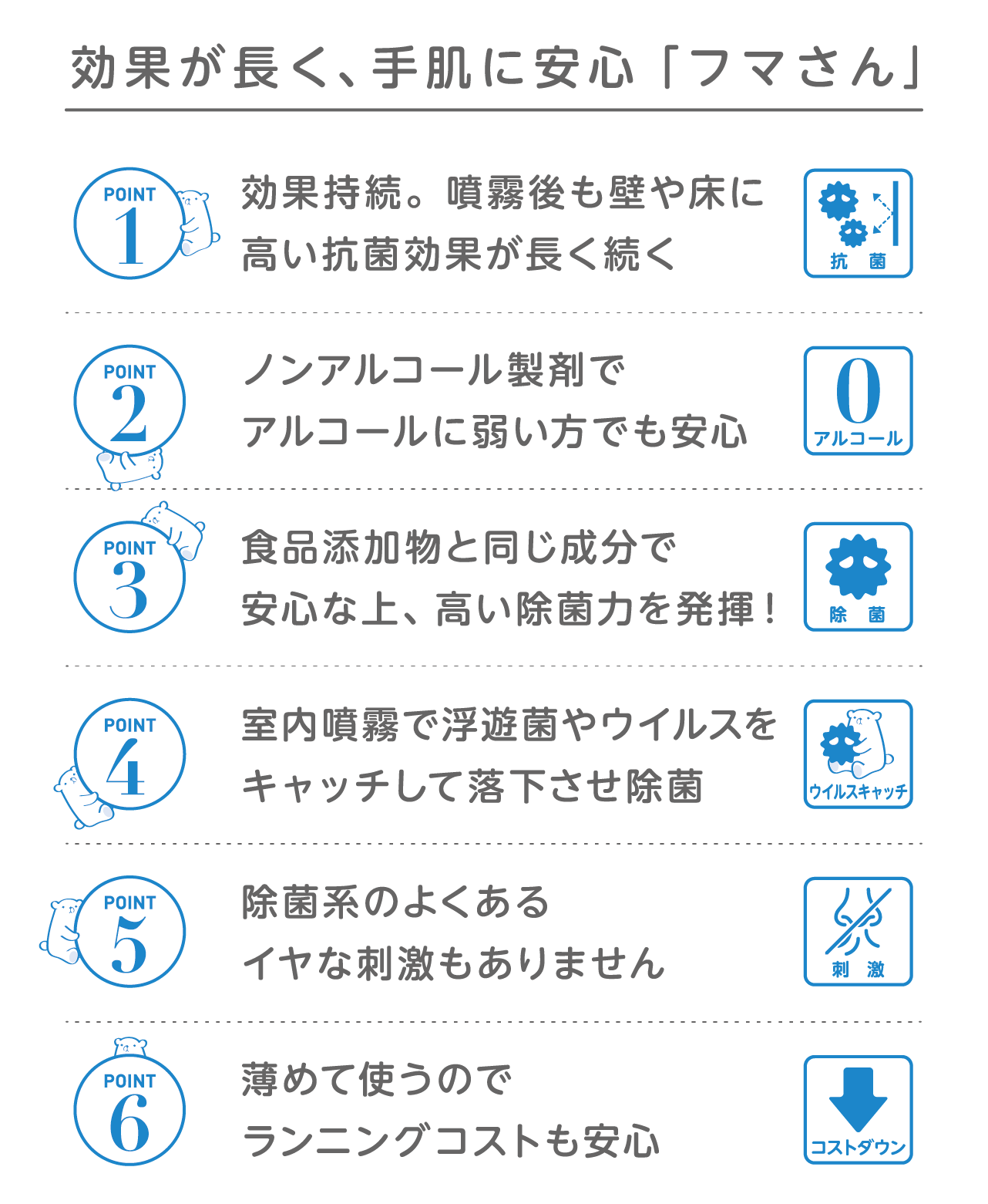 ヒトの肌は日光に晒されると自然にフマル酸を生成します。このフマル酸が主成分の水溶液「フマさん」は、噴霧することで空間に浮遊するや菌や身の回りのウイルスをキャッチし床などに落としで除菌。さらに噴霧後に「フマさん」が付着した床や壁にも長い除菌効果を発揮します。
