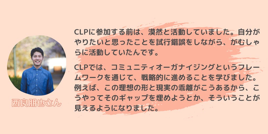 第2弾は一橋大学を拠点とするBridge for Allで活動してきました西良朋也さんです 。メンバーがなかなか増えず、半ば諦めていた時にコーチングでもらったアドバイスを実践。そこから組織に大きな変化が生まれました。チェンジ・リーダー・プログラムが、大学に、そして学生一人一人に与えるインパクトがよくわかる記事となっています。