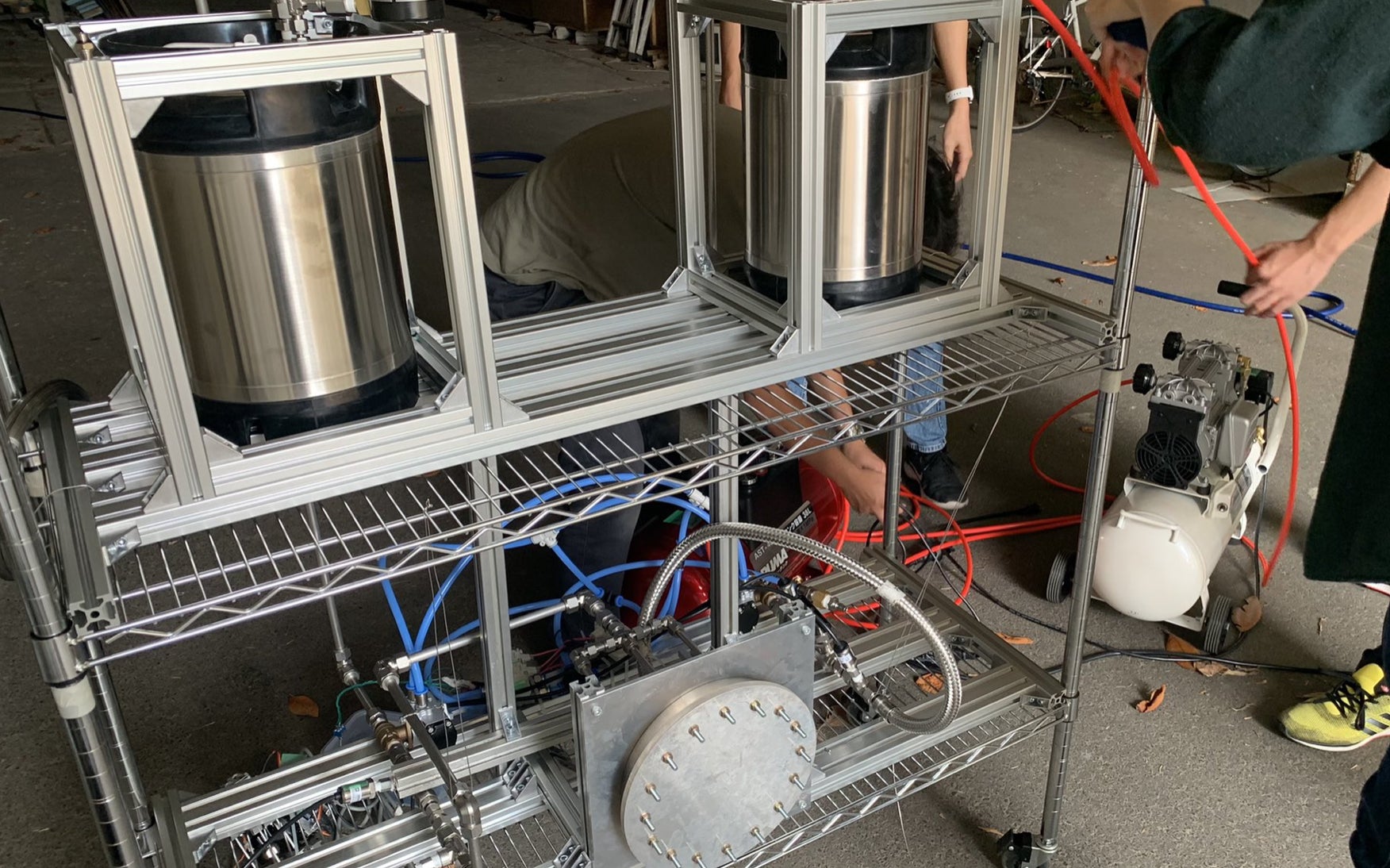 <メンバー全員で部品や配管を考え製作した燃料ラインの実験装置>