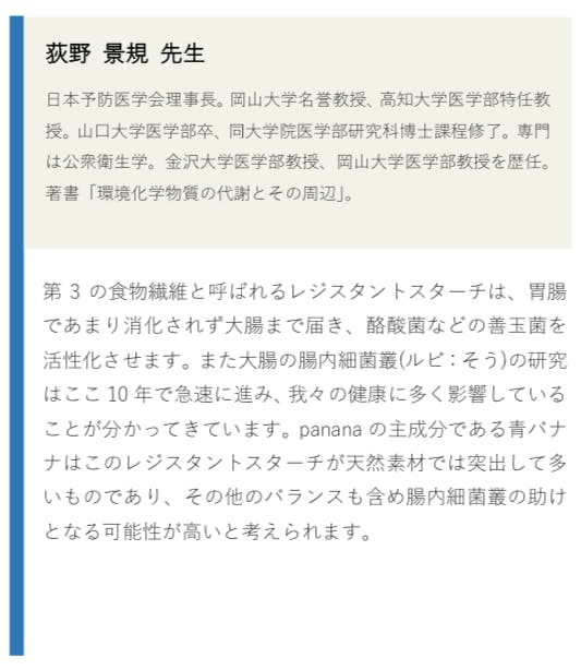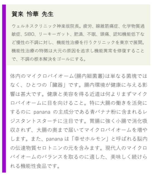 熟す前の青いバナナには「レジスタントスターチ (難消化性でんぷん)」という腸活で注目の成分が含まれています。(自然界の中でもグラム当たりの含有量はトップに匹敵。)これは、大腸の腸内細菌たちのエサとなり、その細菌が短鎖脂肪酸などを生成することで様々な効果があると言われています。近年の分析技術の発展により、大腸内細菌の役割が重要なことがどんどんと分かってきています。