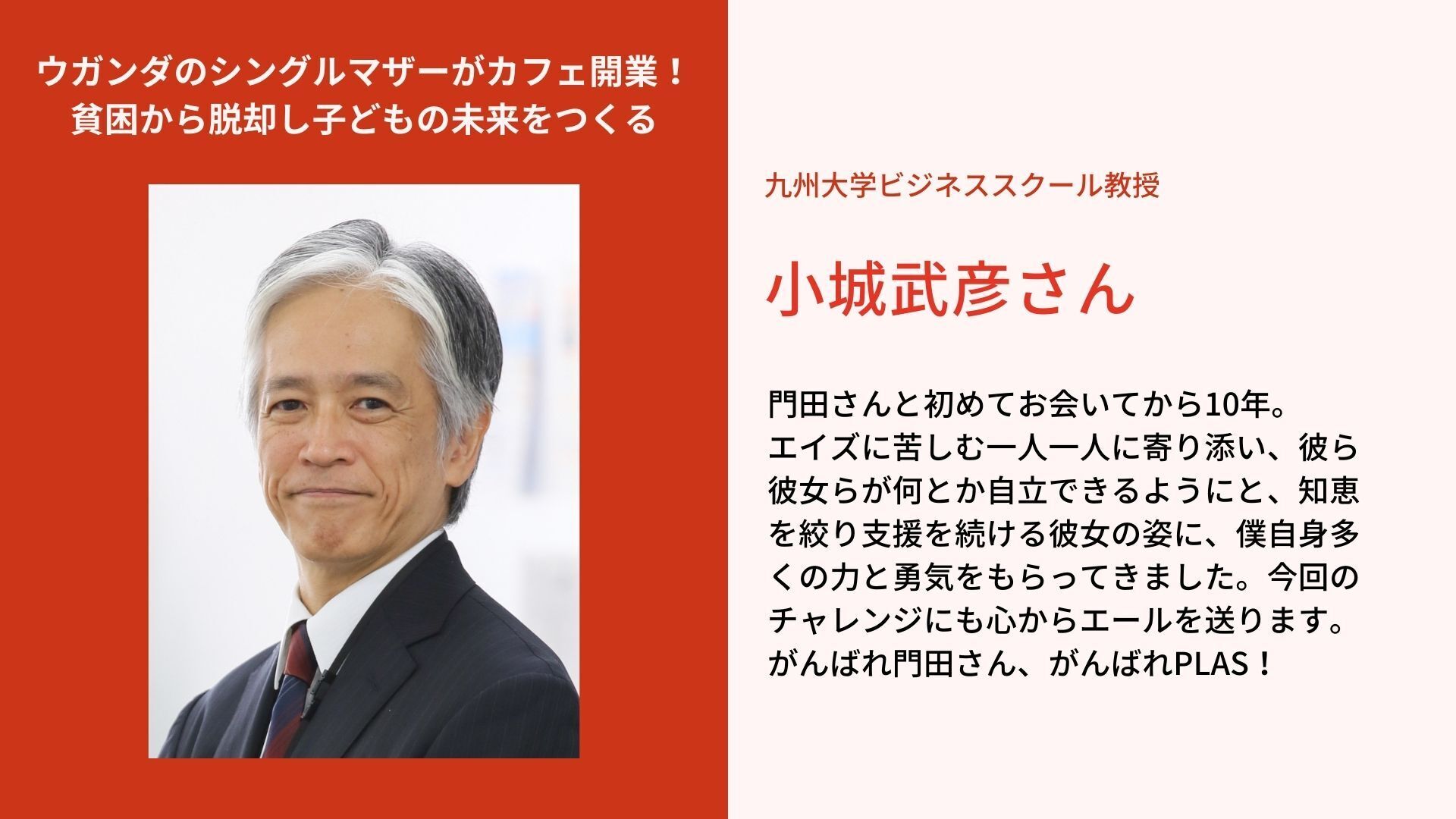 エイズに苦しむ一人一人に寄り添い、彼ら彼女らが何とか自立できるようにと、知恵を絞り支援を続ける彼女の姿に、僕自身多くの力と勇気をもらってきました。今回のチャレンジにも心からエールを送ります。