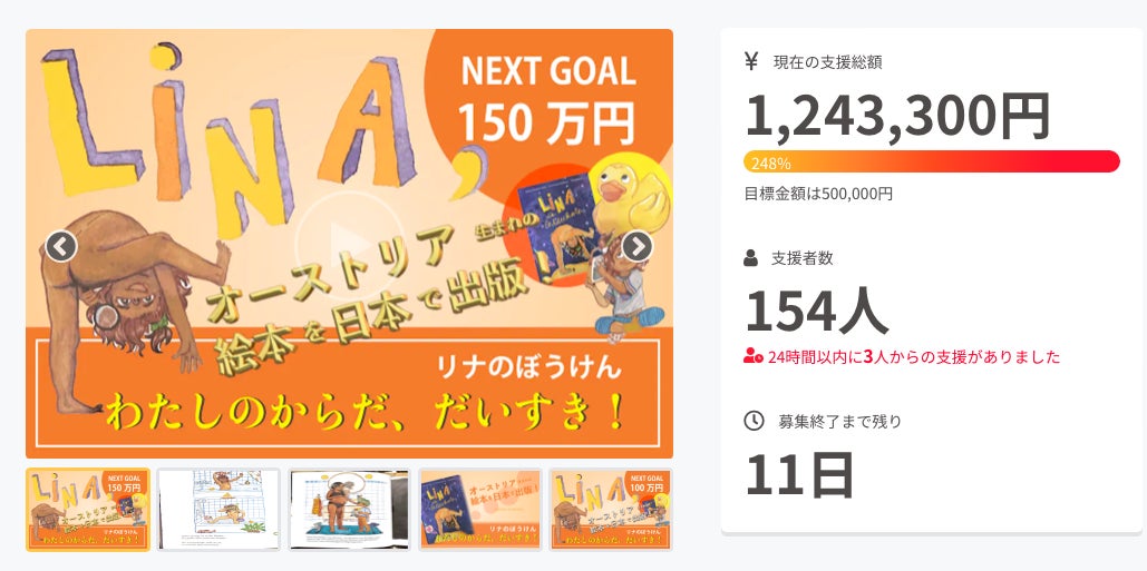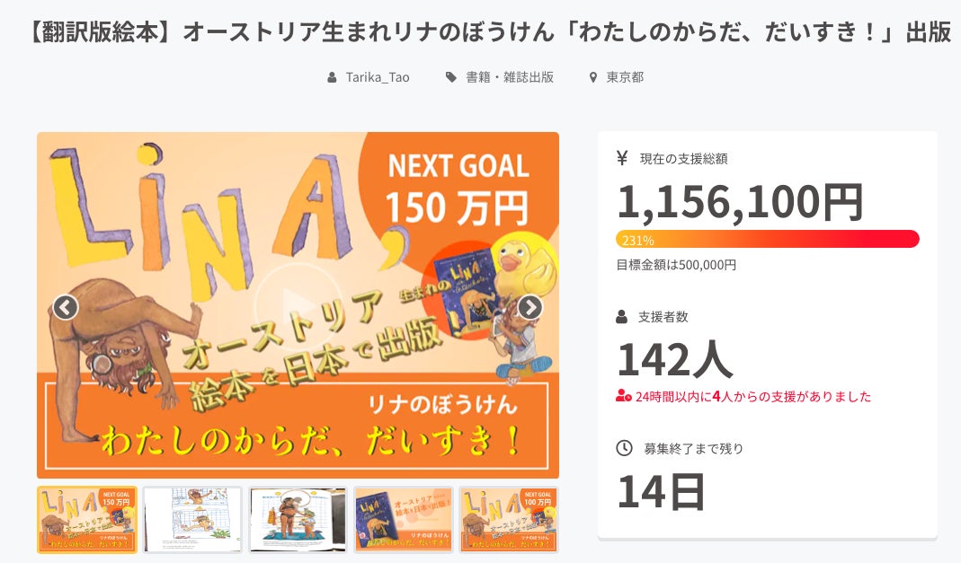 【絵本1冊リターン支援できます!】現在、154人の方にご支援いただいております。開始早々に完売した絵本1冊ですが、現在、リターンに追加しております。赤字で「完売のため追加しました!」と表記しているため、完売されたままだと思われている方が多く、大変ご迷惑をお掛けしております。今後は、数量限定せずにリターン購入できるようになっております。次の目標設定は、150万円とさせていただいておりますが、リナの冒険「わたしのからだ、だいすき」が全国の皆さんに知っていただけるように引き続きご支援のほどよろしくお願いいたします。より多くの方に絵本を手に取っていただくためにも、クラウドファンディングのURLをシェアしていただけますと幸いです。 ▽オーストリア生まれの絵本を日本出版!リナの大冒険「わたしのからだ、だいすき」 https://camp-fire.jp/projects/view/457833
