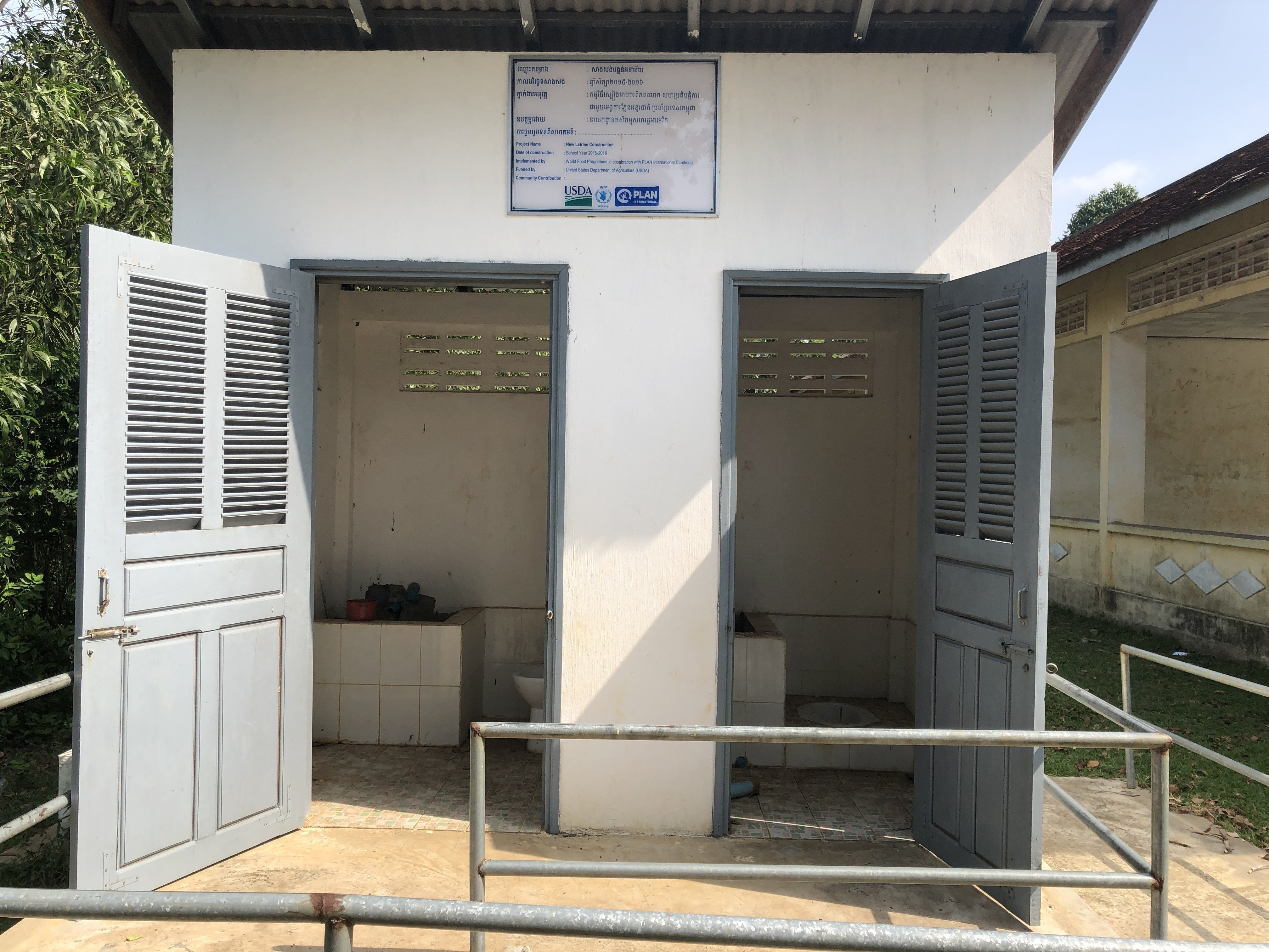 ①日本とカンボジアの国旗、②カンボジアと日本との共同プロジェクトであることのクメール語と日本語の記述、③地域の住民と学校職員の方々、④10名のご支援者様の氏名、⑤ご支援者様の総数(現在29名)、⑥場所、⑦完成年月日