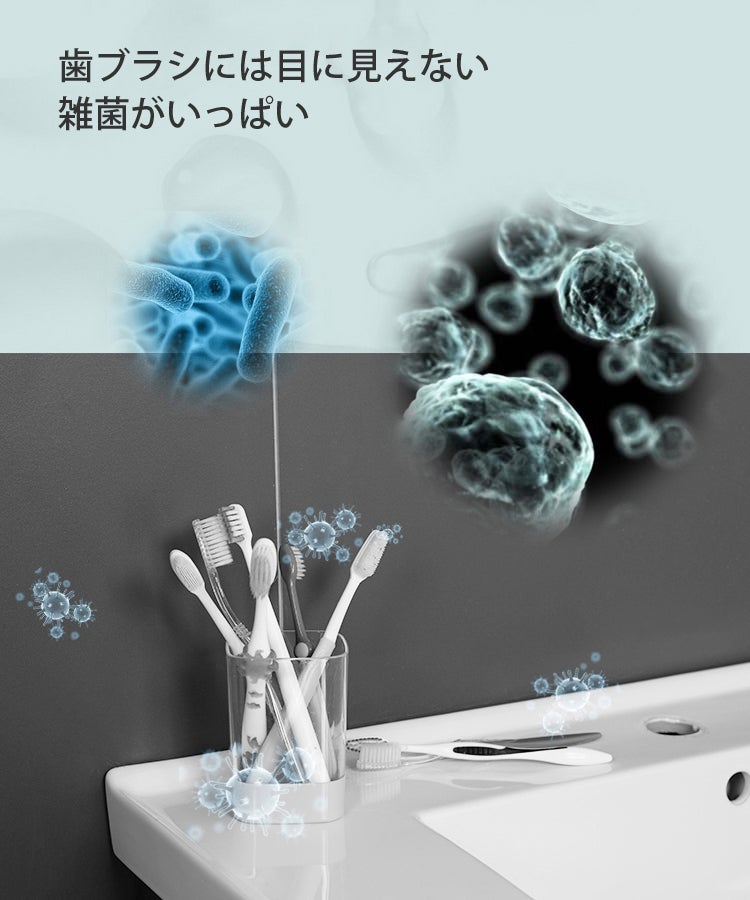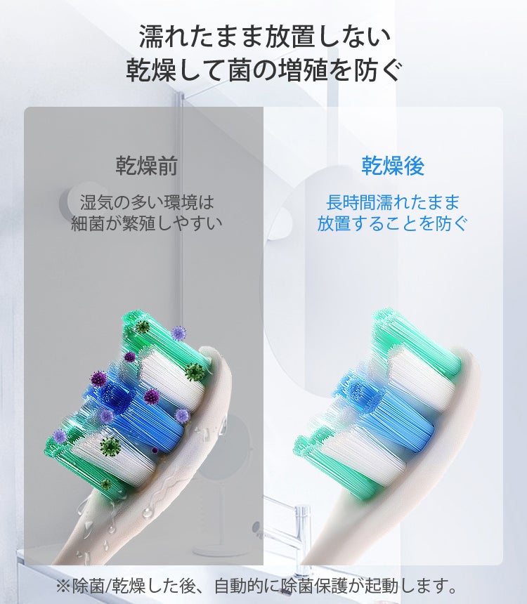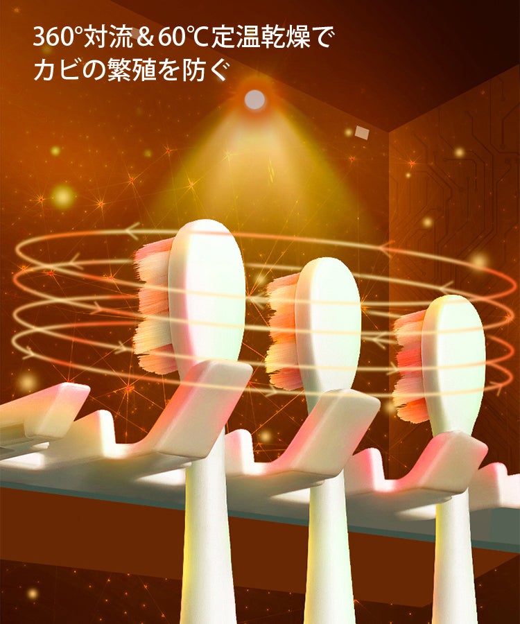 また、360度対流によって歯ブラシについた水分を飛ばすことで、除菌した後の歯ブラシをより清潔に保ちます。