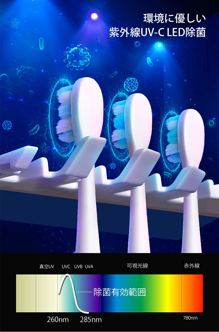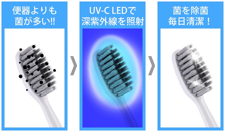 光触媒除菌は、UVC-LED紫外線除菌が消えた後も一定期間歯ブラシを保護する役割があります。