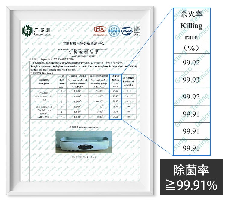 「CLEAN-UP」はなんと除菌率99.91%以上です。検出機関でたったの5分で除菌が可能ということが証明されました。