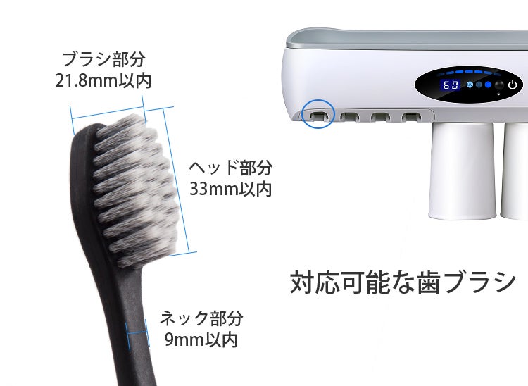 対応可能な歯ブラシのサイズはヘッド部分が33mm以内、ブラシ部分が21.8mm以内ネック部分が9mm以内の歯ブラシです。