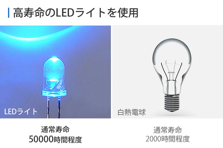 LEDライトは白熱電球と比べて長寿命で25倍の長さのため電球を交換する手間が省けたり、消費電力も少ないため電気代が削減できます。