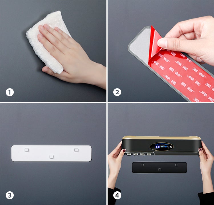 ③壁掛けフックをきれいな壁に貼り付け、壁と十分に粘着させるため均一に押さえてください。24時間以上貼り付けたままの状態にしてください。