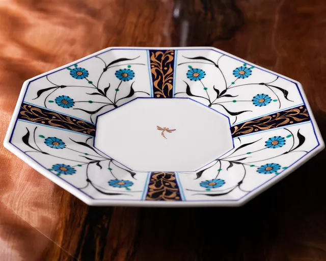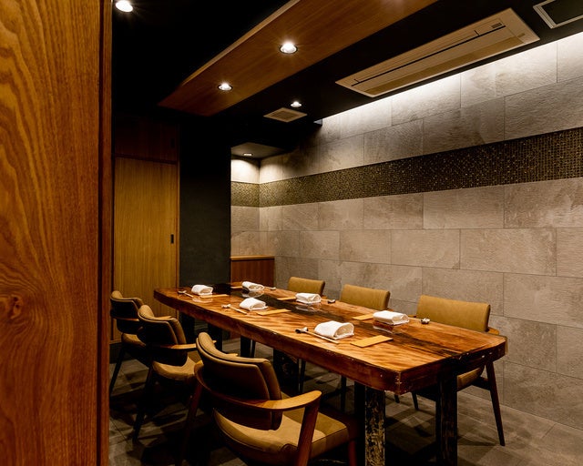 店内には岐阜産の木々で設えたカウンターやイス、インテリアに用いられた多治見市名産タイルなど岐阜の温もりを感じられる空間の中にカウンター8席と個室6席をご用意。器も三宅氏自らがこだわってデザインした美濃焼を使用し、旬の料理を引き立てる。