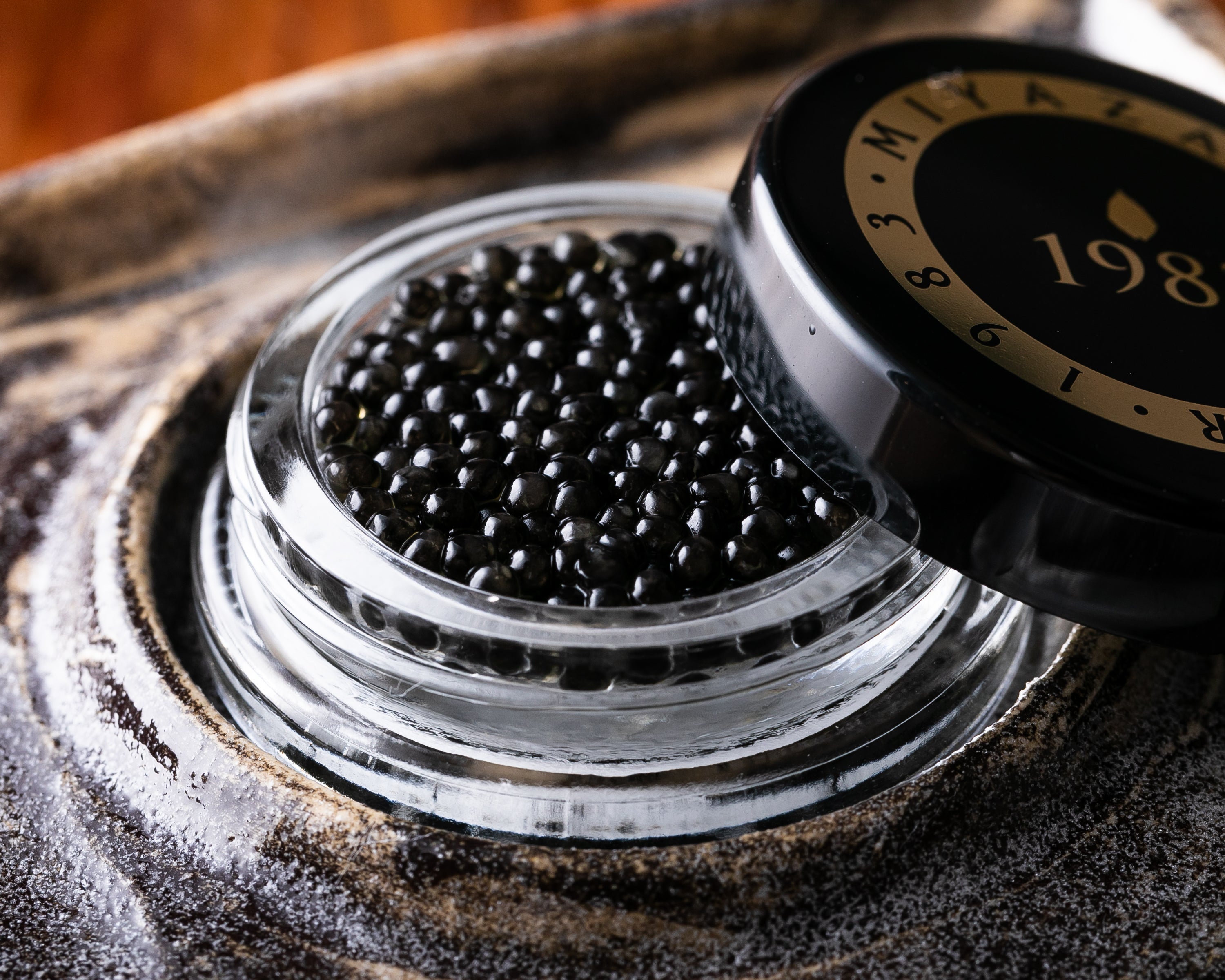 スペシャリテの一つは、宮崎で特別に仕立ててもらう三宅オリジナルの「キャビア」。ヨーロッパ産の物より小粒で、一般的なキャビアよりも塩味を抑えられたクリーミーな味わいは、国内外の多くのゲストを虜にする。