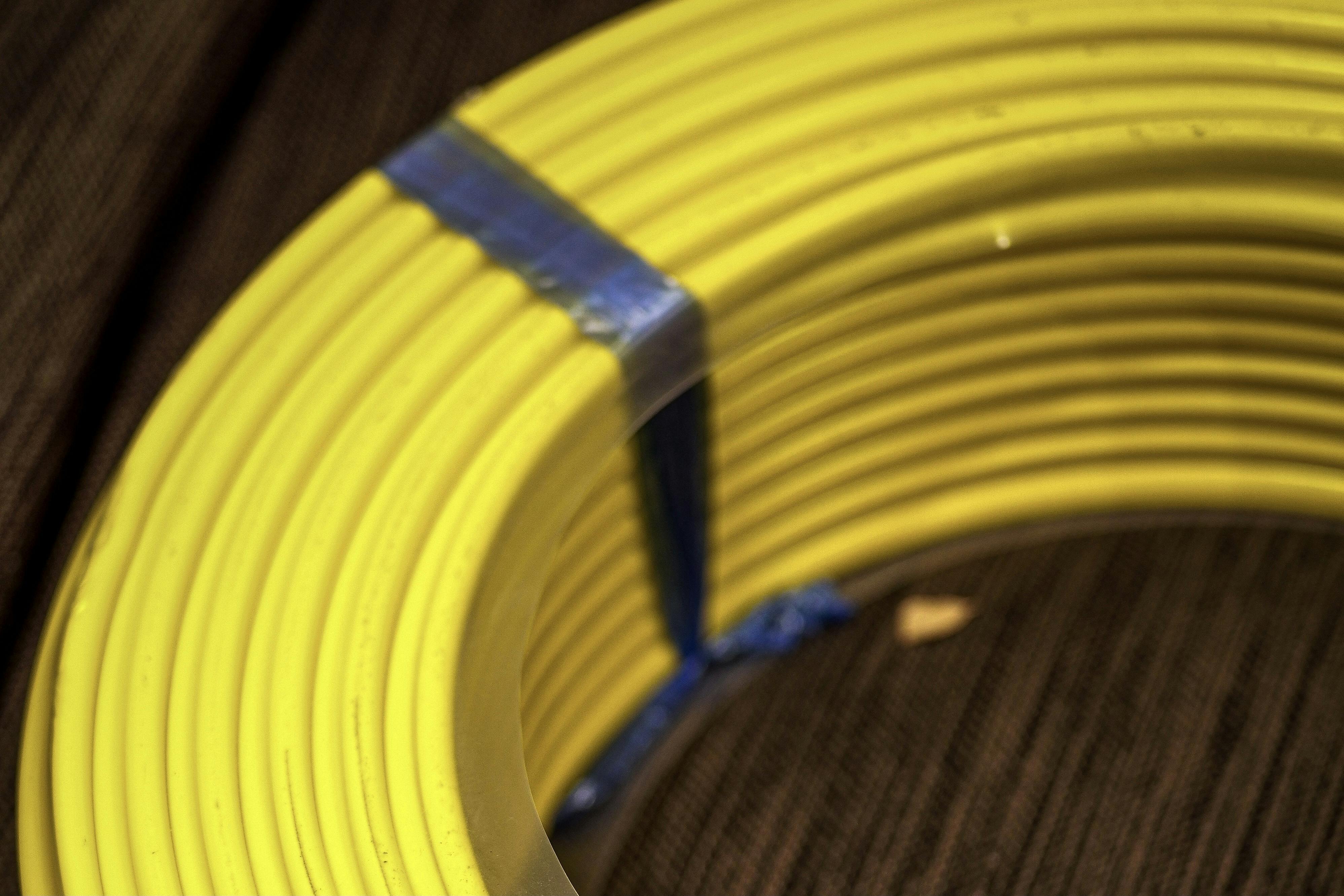 写真が、その電線なのですが、なんと被覆が黄色。普通はグレーですが、敢えて目に入れる・目立たせるという選択にしました。調べてみると、黄色以外にも様々な色があります。